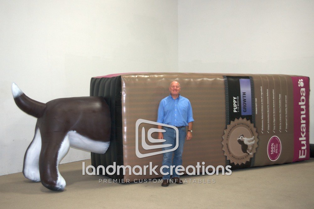 Dog nutrition company, Eukanuba, promotes their puppy food to new pet owners at marketing events and trade shows with this fun inflatable product replica.