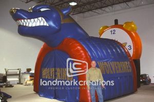 This is what most people think of when inflatables come to mind. Available in custom sizes and designs, cold-air inflatables can be mounted on the ground, on rooftops, indoors or at any fixed location. They inflate with the aid of a blower system in just minutes bringing your product replica, mascot, logo or sports tunnel to life.