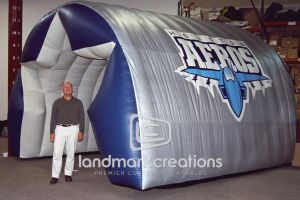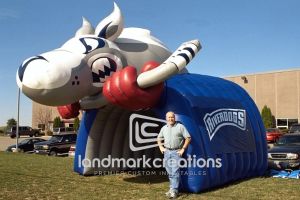 This is what most people think of when inflatables come to mind. Available in custom sizes and designs, cold-air inflatables can be mounted on the ground, on rooftops, indoors or at any fixed location. They inflate with the aid of a blower system in just minutes bringing your product replica, mascot, logo or sports tunnel to life.