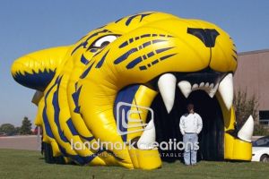 This is what most people think of when inflatables come to mind. Available in custom sizes and designs, cold-air inflatables can be mounted on the ground, on rooftops, indoors or at any fixed location. They inflate with the aid of a blower system in just minutes bringing your product replica, mascot, logo or sports tunnel to life.