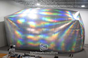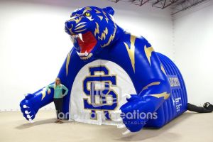 This is what most people think of when inflatables come to mind. Available in custom sizes and designs, cold-air inflatables can be mounted on the ground, on rooftops, indoors or at any fixed location. They inflate with the aid of a blower system in just minutes bringing your product replica, mascot, logo or sports tunnel to life.