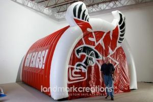 This is what most people think of when inflatables come to mind. Available in custom sizes and designs, cold-air inflatables can be mounted on the ground, on rooftops, indoors or at any fixed location. They inflate with the aid of a blower system in just minutes bringing your product replica, mascot, logo or sports tunnel to life.