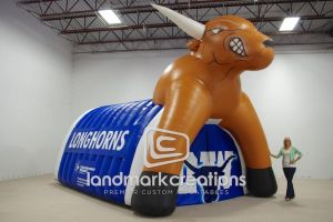 This is what most people think of when inflatables come to mind. Available in custom sizes and designs, cold-air inflatables can be mounted on the ground, on rooftops, indoors or at any fixed location. They inflate with the aid of a blower system in just minutes bringing your product replica, mascot, logo or sports tunnel to life.