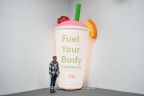 This giant inflatable smoothie cup replica for 310 Nutrition showcases their #310Shake complete with a green straw and cut fruit pieces. The custom inflatable replica has an internal LED light system, so it promotes their "Fuel Your Body" messaging and the brand at events and retail locations both day and night.