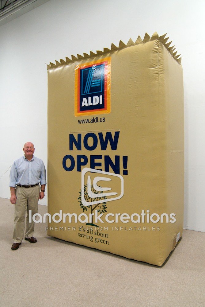 Announce the opening of your business in a unique way with a custom-designed inflatable. Easily recognized, this grocery bag helped ALDI gain attention in the community when inflated in front of the newly opened store.