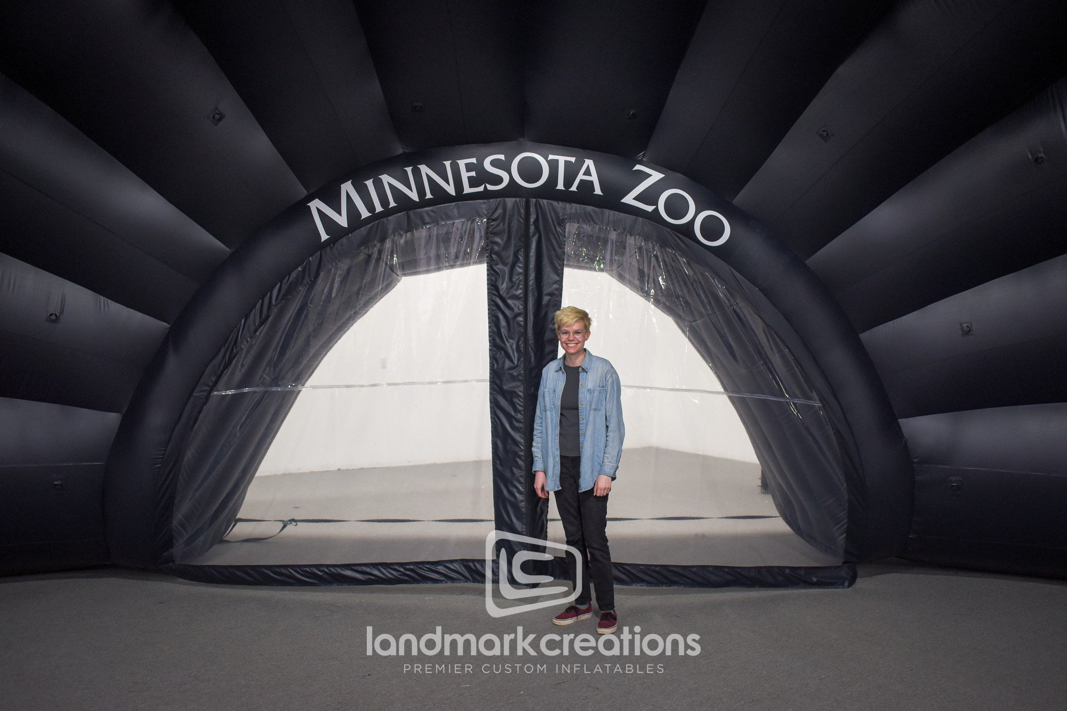 The Minnesota Zoo had this custom inflatable structure created to serve as a portable amphitheater to be used for live events in outdoor spaces at the zoo. Because inflatables are easy to set-up an store between events, they're a perfect solution for creating temporary shelters or stages. With removable messaging and custom color matching, inflatable amphitheaters can also be created to support any branding or event specific messages, too!