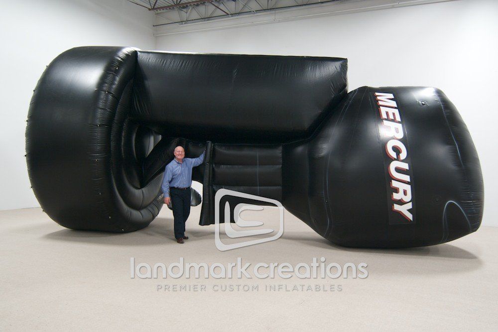 Mercury Marine, a leader in marine propulsion and technology, uses this giant inflatable boat motor product replica to stand out in a sea of trade show booths and outdoor advertisements.