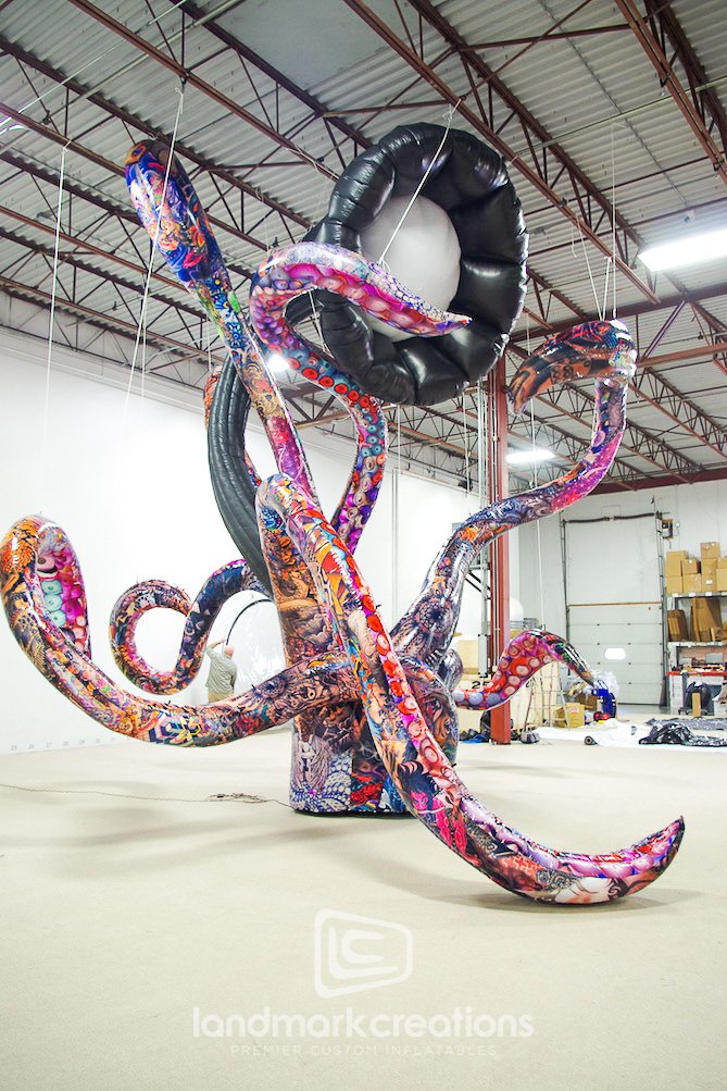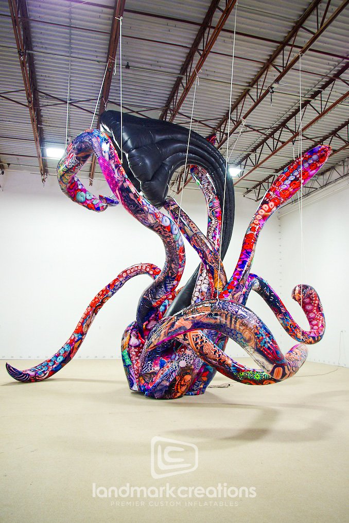 Art Installation "Whatisit" by artists Brian Kane intrigues viewers. In addition to "Whatisit", Brain Kane has realized several of his artistic visions in giant form using the inflatable medium. Some of his other installations include shapes like location devices, speech bubbles, and a chrome anvil. The level of detail the Landmark team can achieve using custom inflatables alone or by integrating fabricated components allows us to help any artist create, or recreate, their vision on a giant scale.