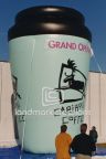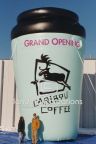 This giant inflatable coffee cup, complete with logo and 'Grand Opening' banner, was used to increase visibility for multiple Caribou Coffee locations during grand opening celebrations!