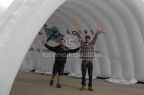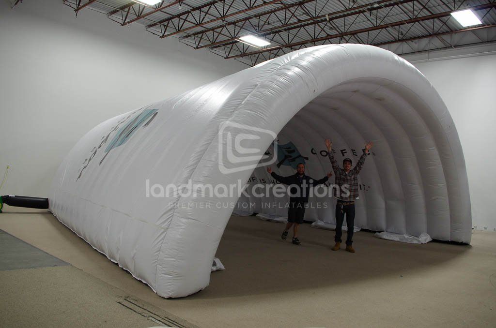 Caribou Coffee gets double duty from their inflatable sports tunnel, using it as a start/finish line at races and as a sheltered gathering place for passing out product samples.