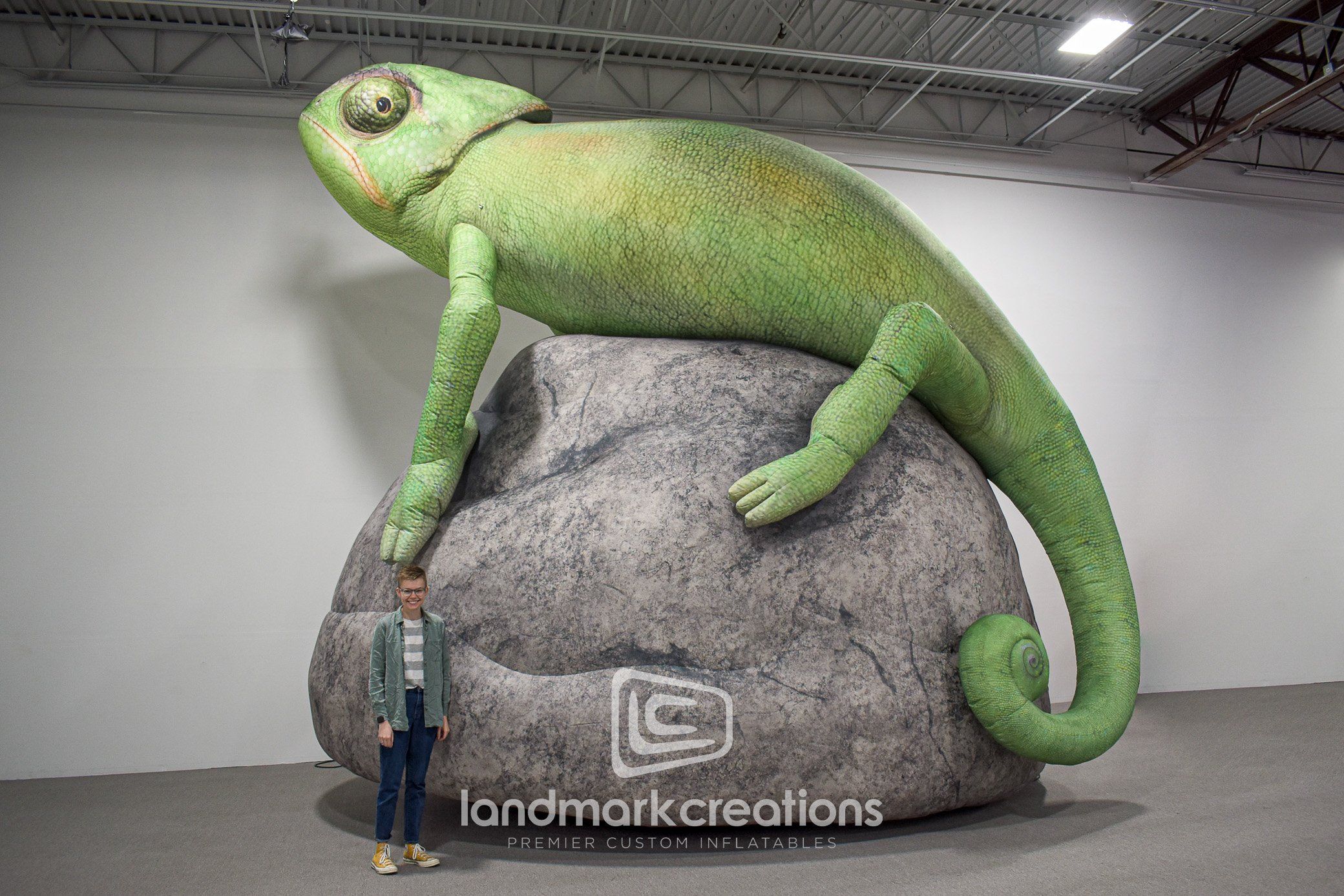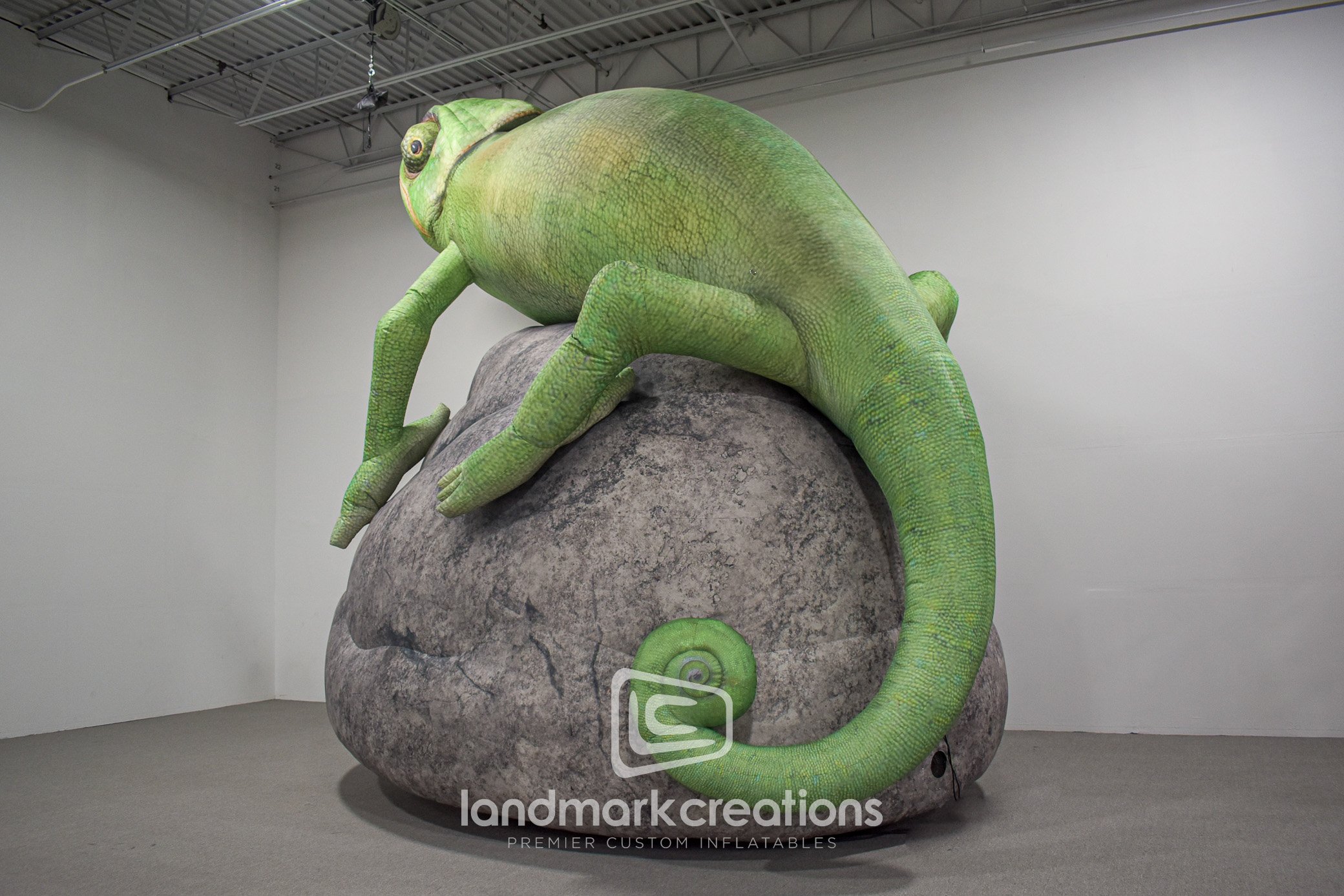 Perched atop a giant rock, this giant inflatable chameleon display connects with crowds at the Virginia Zoo's "Zoolumination" outdoor exhibit. The chameleon features an internal LED light system which can change colors, creating stunnning visuals for evening events.