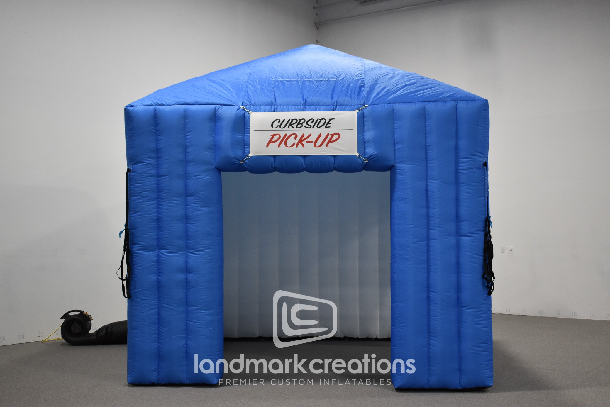 Our inflatable kiosk structure features two solid walls for messaging on both sides as well as two message areas above the doors for standard 1.7’ x 3’ interchangable banners. Perfect for businesses offering curbside pick-up of online orders and take-out.