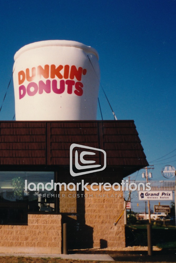 Dunkin' Donuts restaurants use inflatable product replicas of their classic coffee cup to attract attention during grand opening events and special coffee and baked goods promotions.