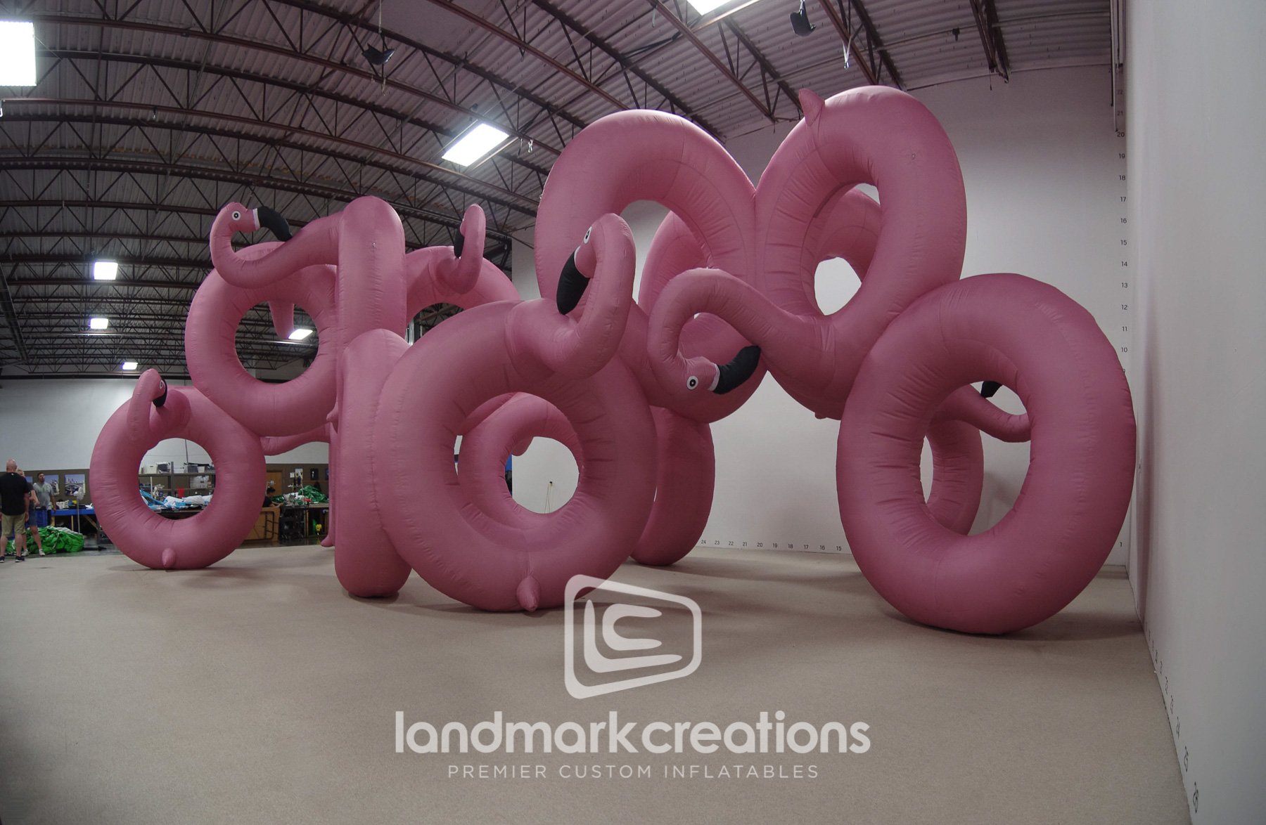 The New York Pinknic Festival commissioned artist Cyril Lancelin of creative studio Town and Concrete to create a giant sculpture for the event. By using inflatables as the medium for his immersive installation, he simulated the look and feel of flamingo pool floaties. Durable, transportable, and reusable- inflatables are a perfect way for festivals to make large-scale artistic visions come to life without all the back breaking and costly work of hard-form, permanent art installations.