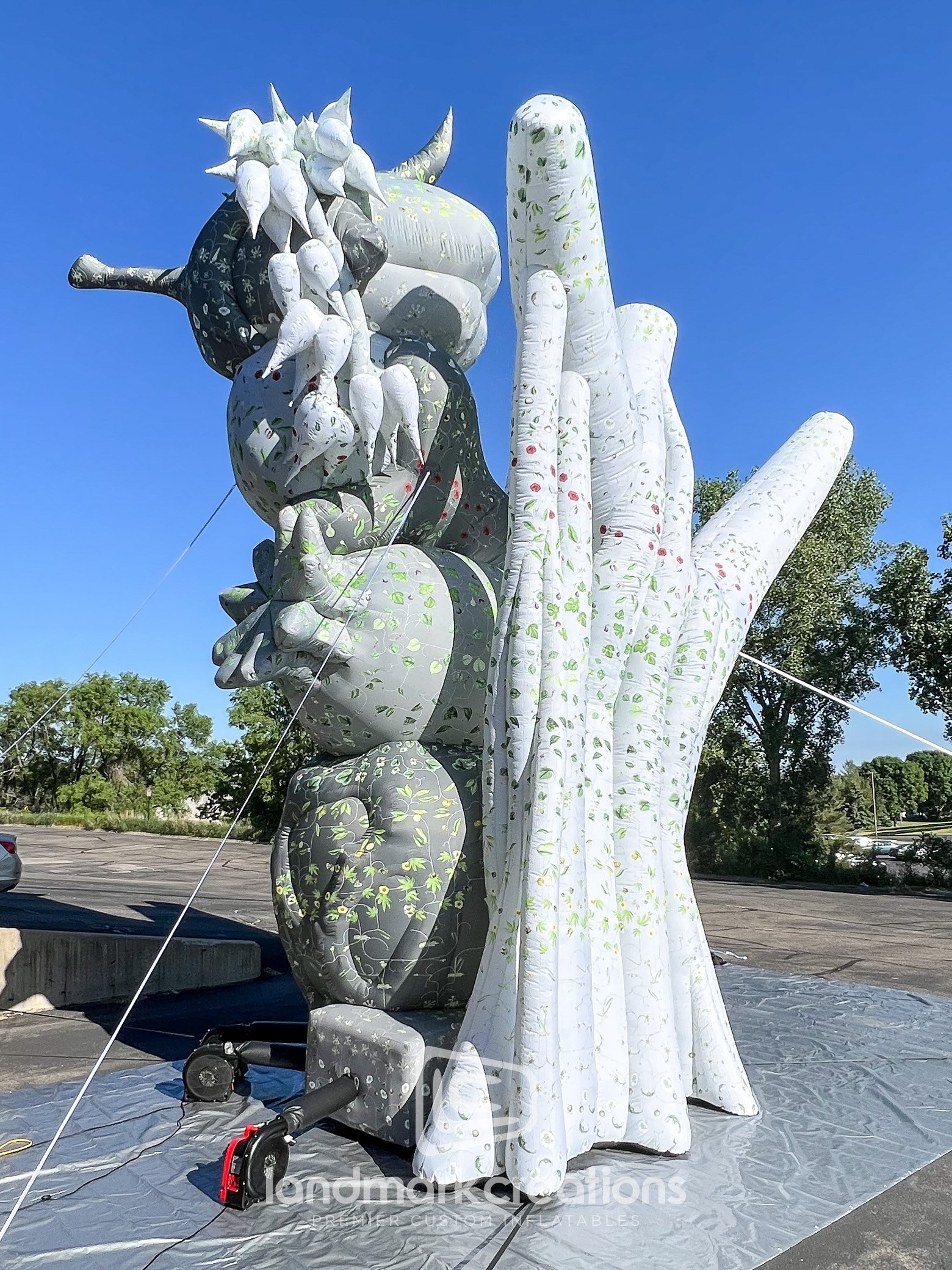 These custom inflatable sculptures are part of the Floating Museum’s installation ‘The Garden’, a collaboration with Kushala Vora featured at Expo Chicago 2023. ‘The Garden’ project is intended to start conversations and showcase performances about the movement of people and plants. The inflatable sculptures are designed to represent the role of plants in shaping the world and how they have affected ecological change, colonialism, capitalism, and violence. The project focuses on exploring the themes of diaspora, improvisation, and creating a space for musicians and performers. The sculpture and platform transform into a performance series at night, and docents engage the public during the day. The project aims to create a pluralistic approach to monumentality by blurring the lines between dialogic platform, sculpture, and performance. Learn more about this installation and all of the Floating Museum projects at https://floatingmuseum.org/