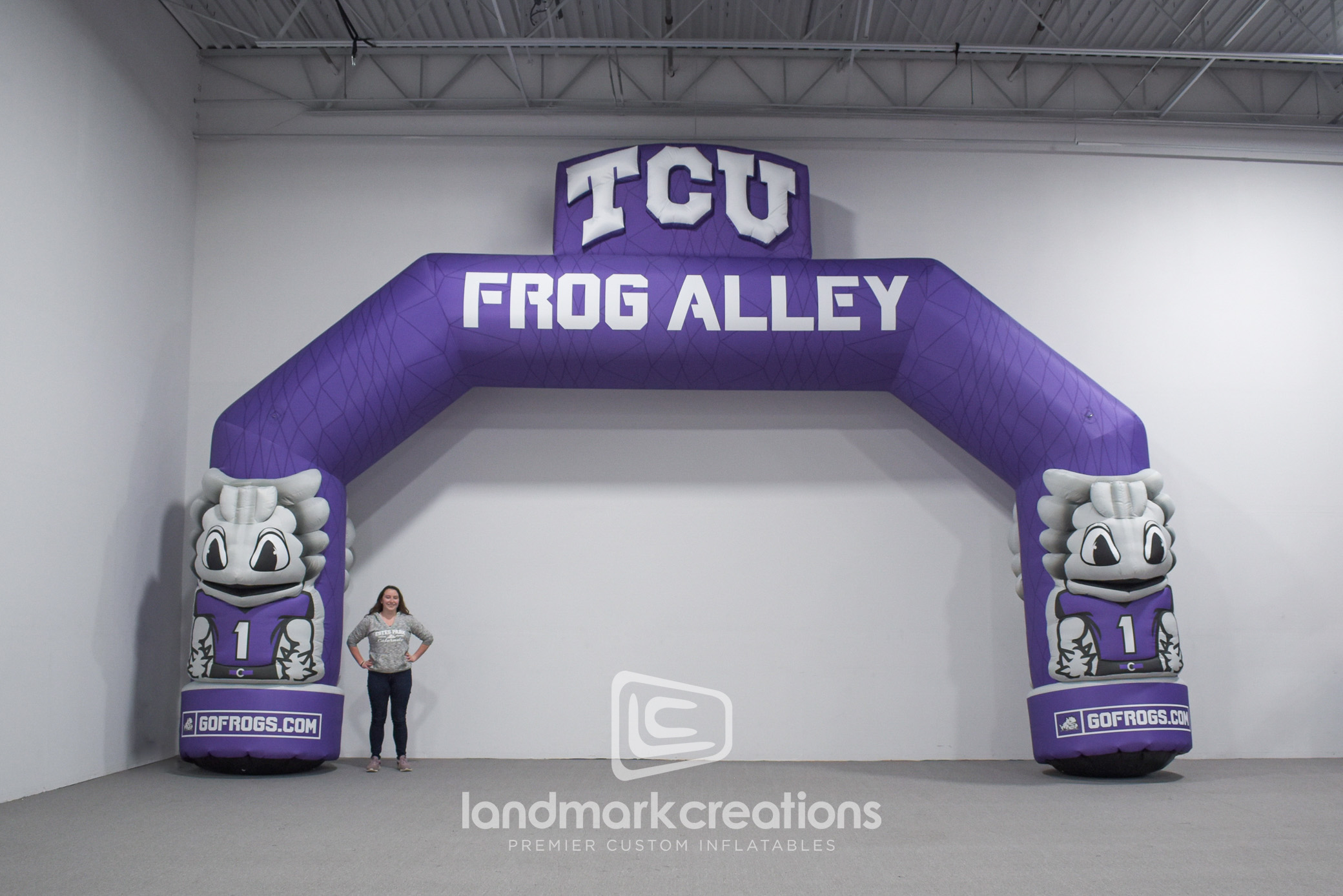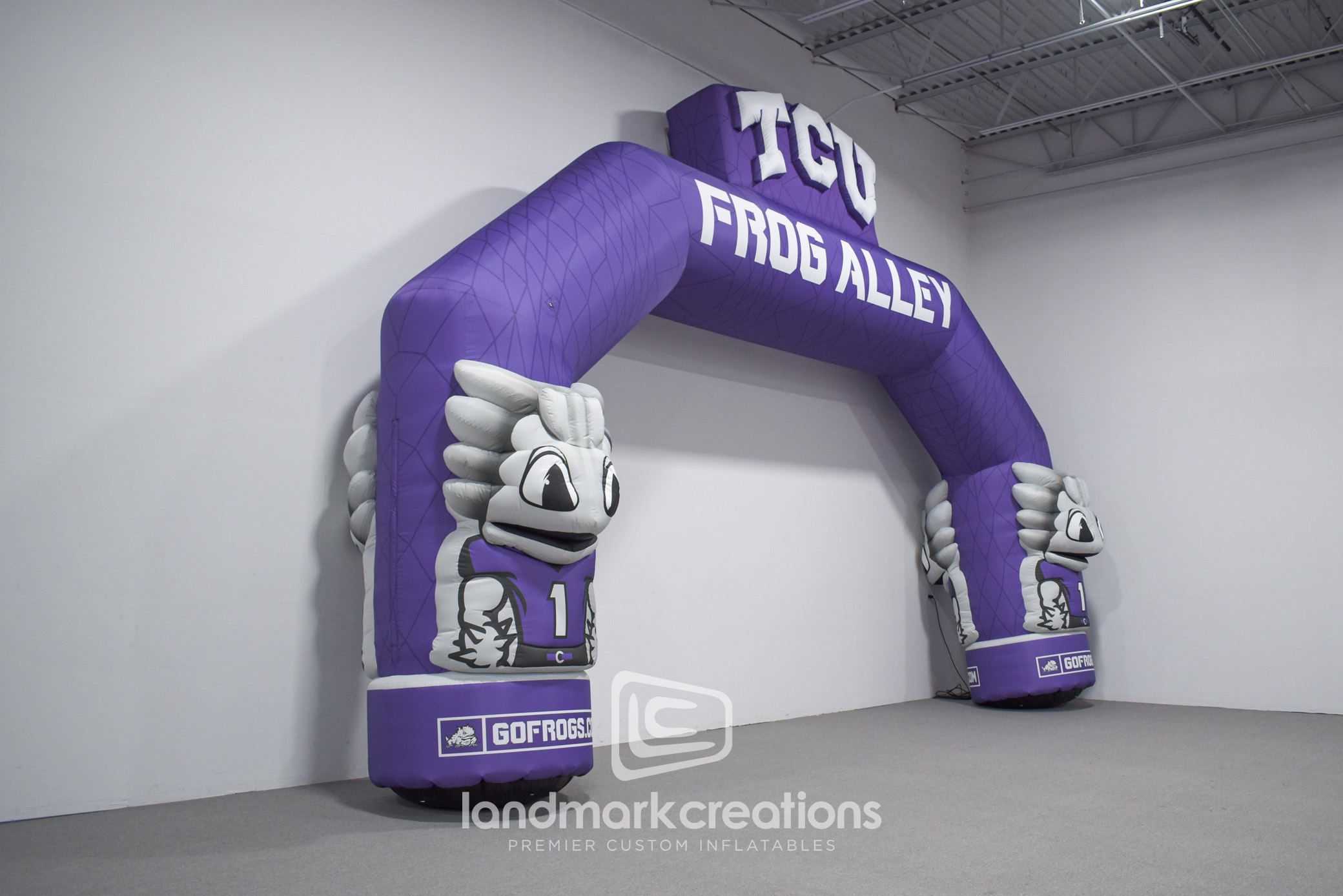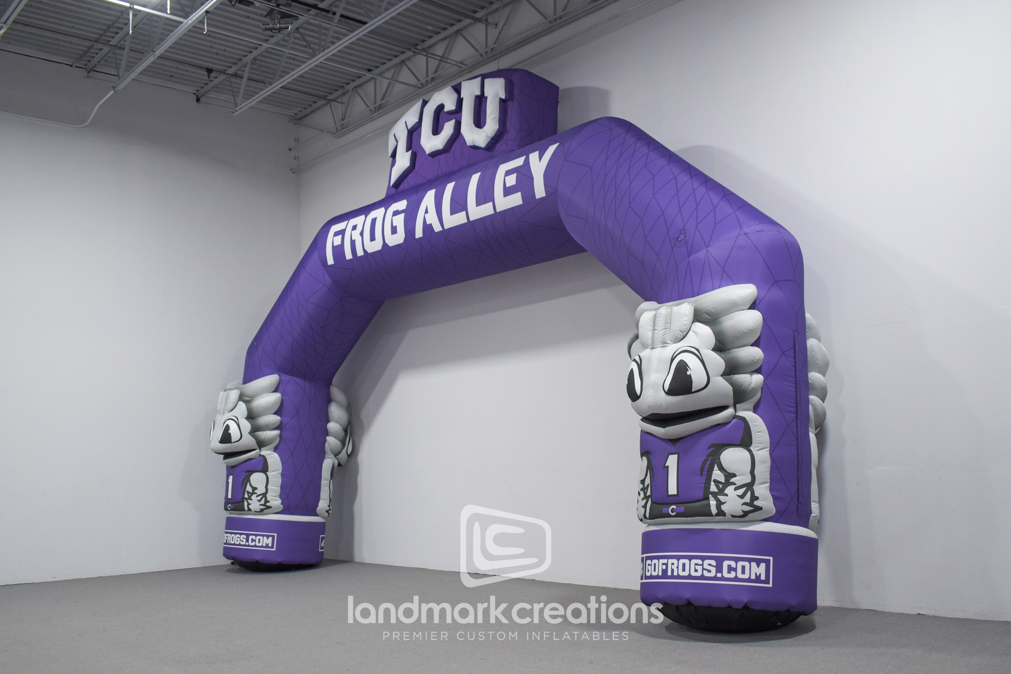 The Frog Alley Arch, a custom inflatable designed for Texas Christian University's (TCU) athletic events, creates a bold and engaging entrance for fans and participants. Standing 19 feet tall and 28 feet wide, this double-sided arch features striking 3D TCU logos and mascots on each leg, making it the perfect centerpiece for sporting events. Developed in collaboration with ProPac Agency, this inflatable arch showcases how branded entrances can amplify school spirit and elevate game day experiences.