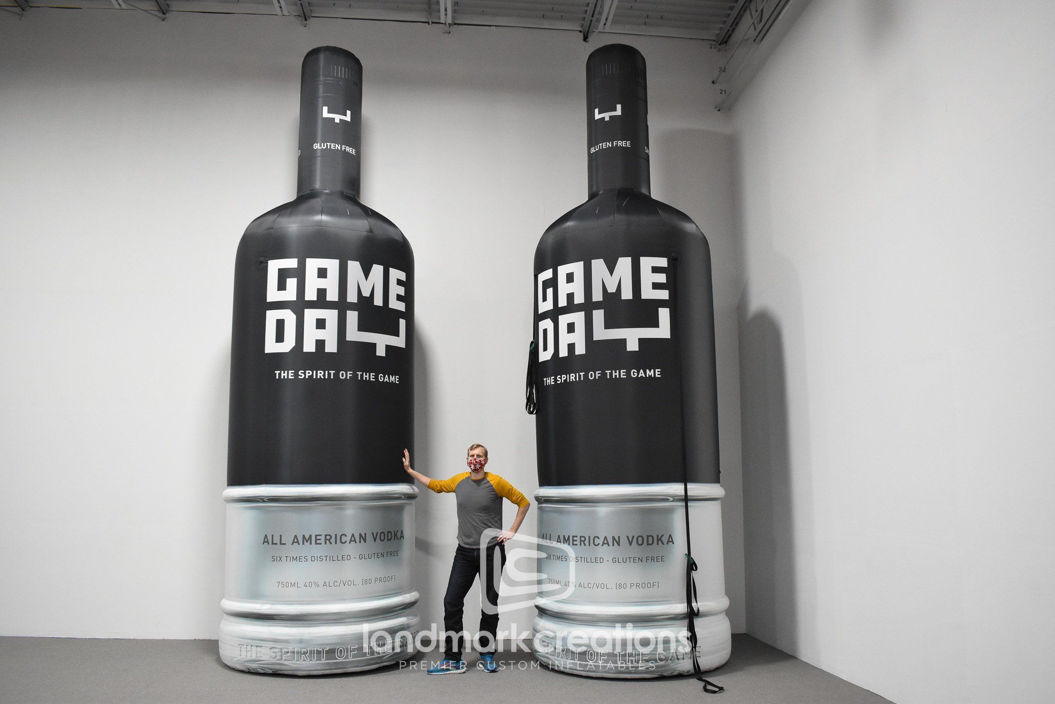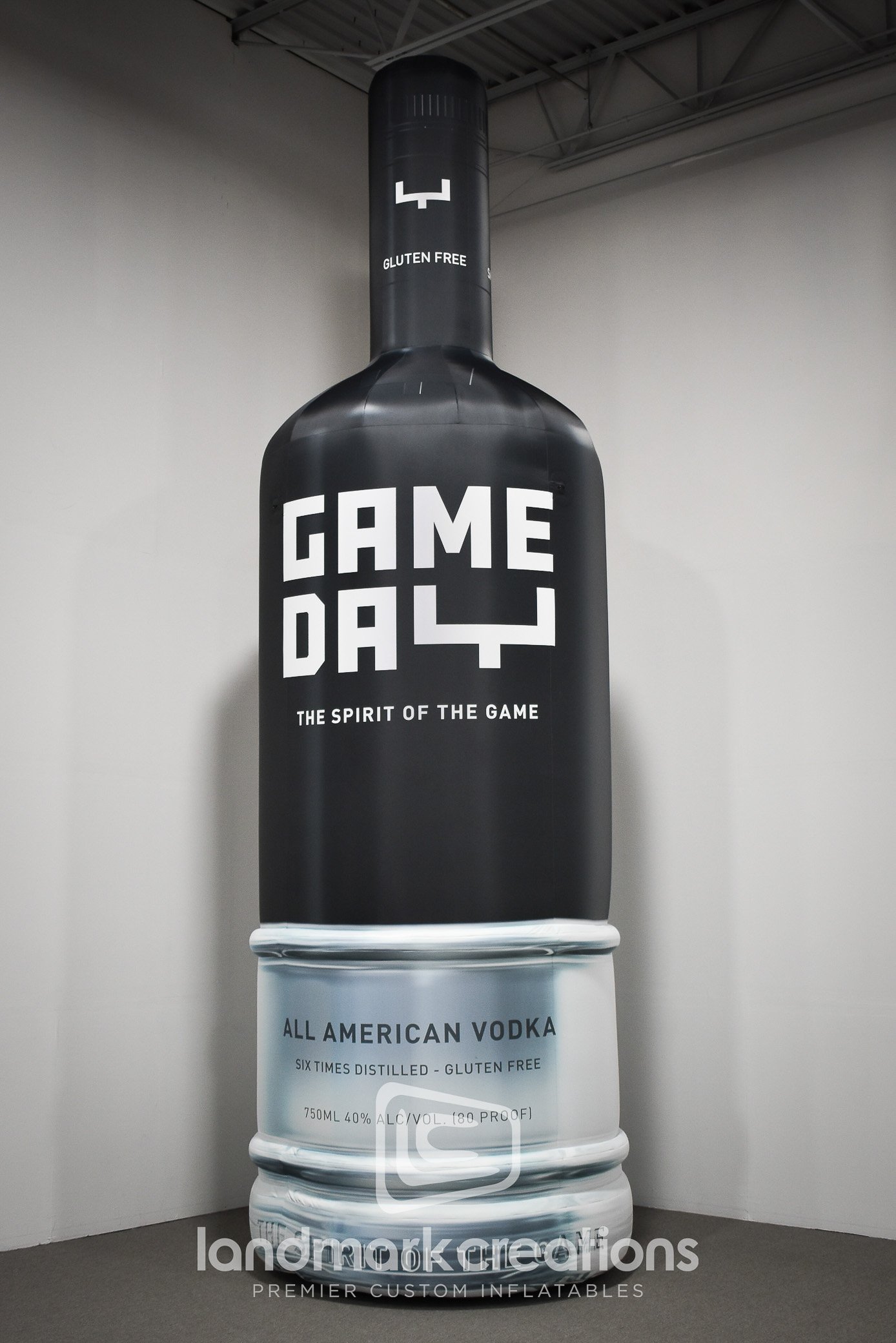 The giant inflatable Game Day Vodka bottle promotes the company's brand while offering a perfect photo opp for fans at various sportis events. Custom inflatable product replicas are perfect for creating giant visuals while packing small, so they can be easily stored and transported between locations.