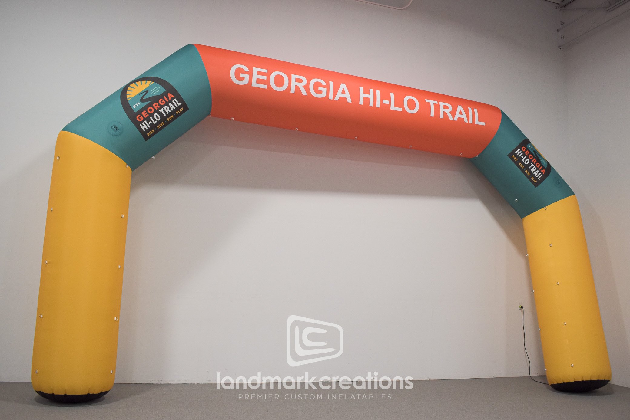The Athens to Savannah Bike Ride is 3-day, 285-mile supported road ride from Athens to Savannah, GA with the goal of raising awareness for the proposed Georgia Hi-Lo Trail. The group's custom inflatable arch is used at the starting line and it features the "Georgia Hi-Lo Trail" Logos and messaging across the top. The sides of the starting line arch include attachment points for sponsor banners or custom messaging as needed.