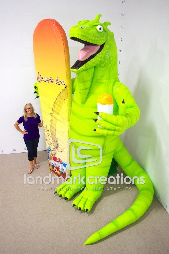This massive green inflatable lizard complete with surfboard and snow cone will be used to connect with outdoor crowds & promote Lizza's Island Water Ice.