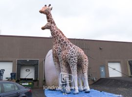 This single giraffe inflatable display was created as part of the Virginia Zoo's "ZooLumination" winter event. At 36 feet tall and internally lit, this giant giraffe replica creates a visual spectacle for guests, especially when it is inflated near the zoo's inflatable giraffe pair.
