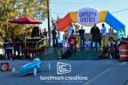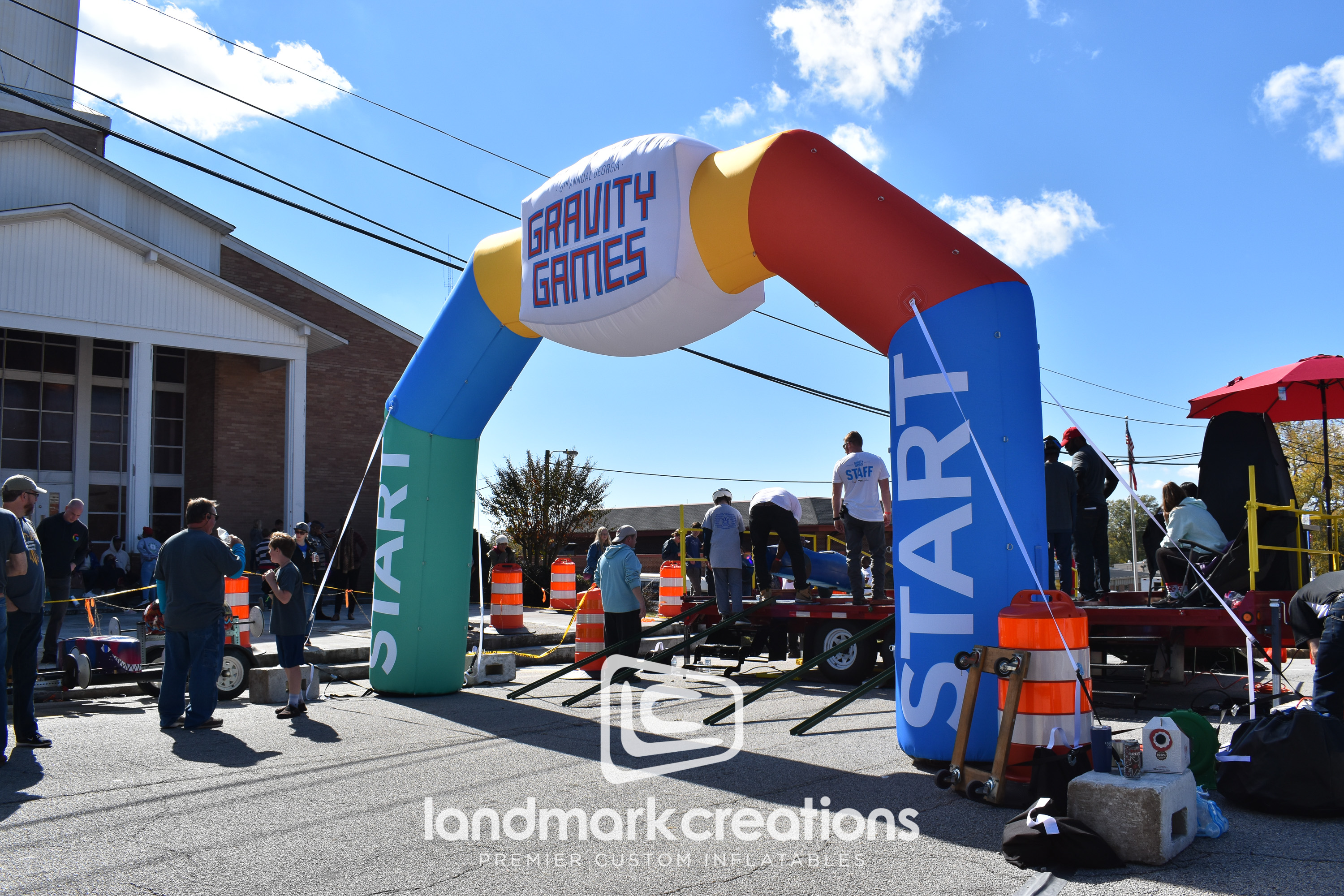 This vibrantly colored arch marks off the starting line for the North Carolina Gravity Games soap box race car track and doubles as a visual for group photos after the event.