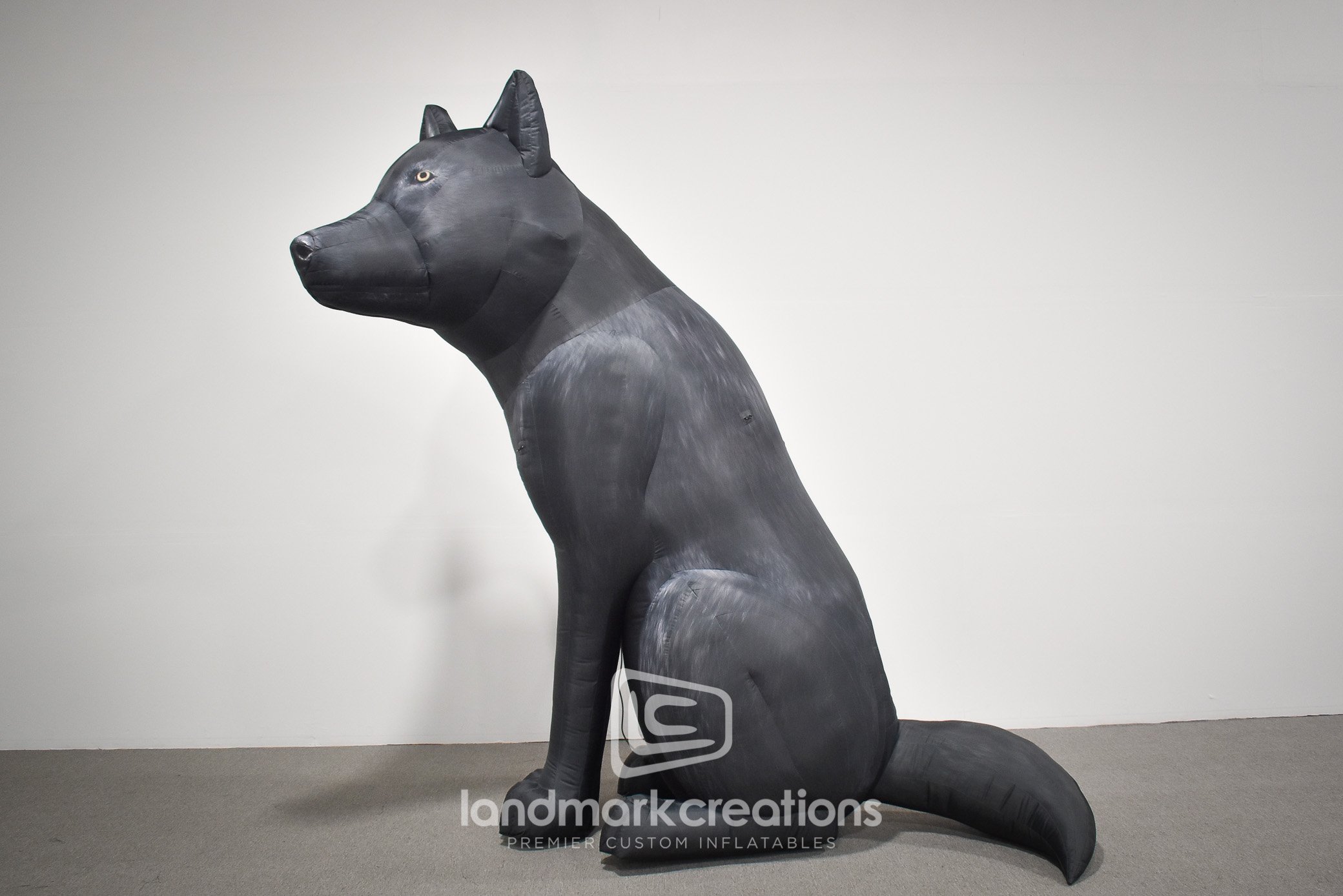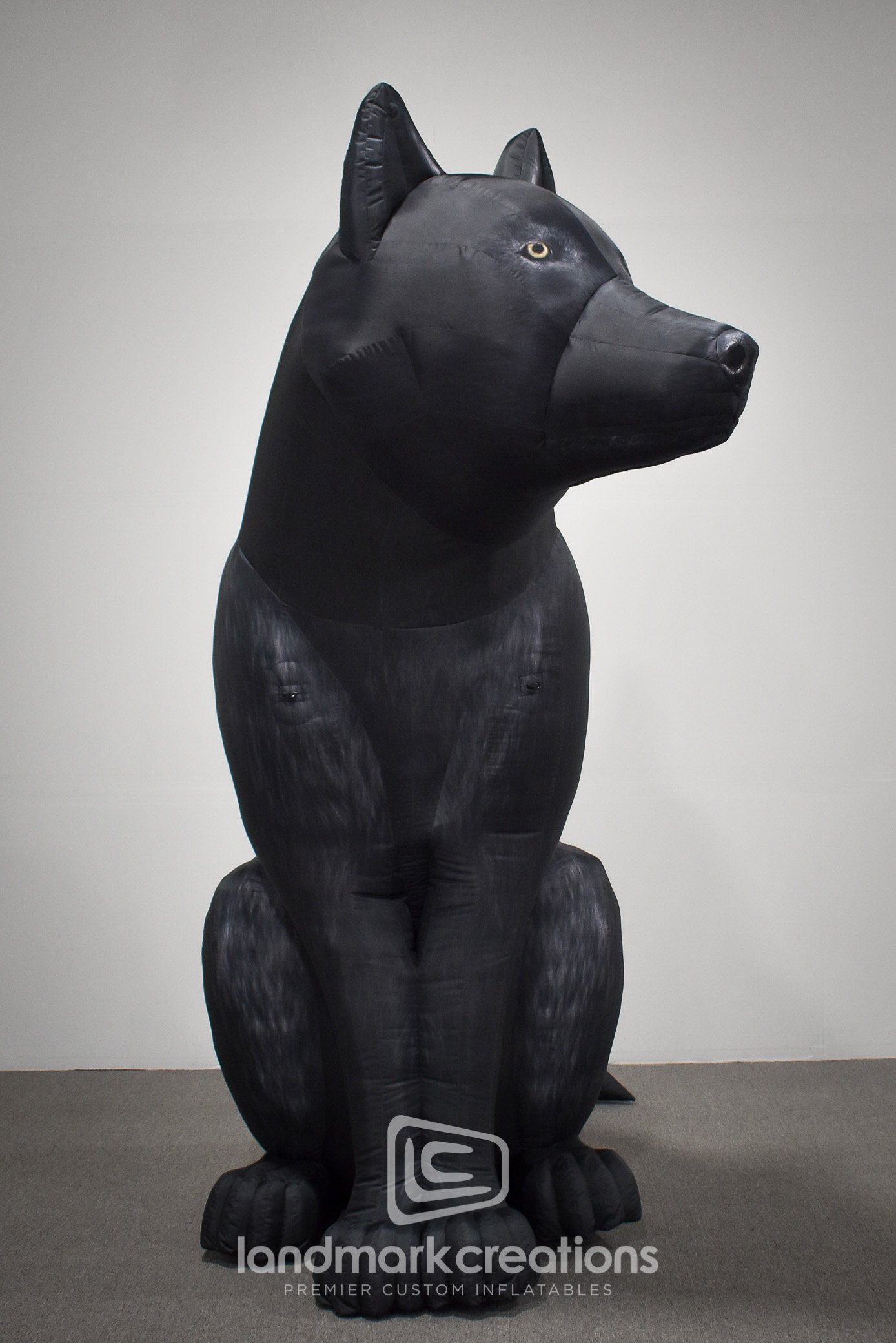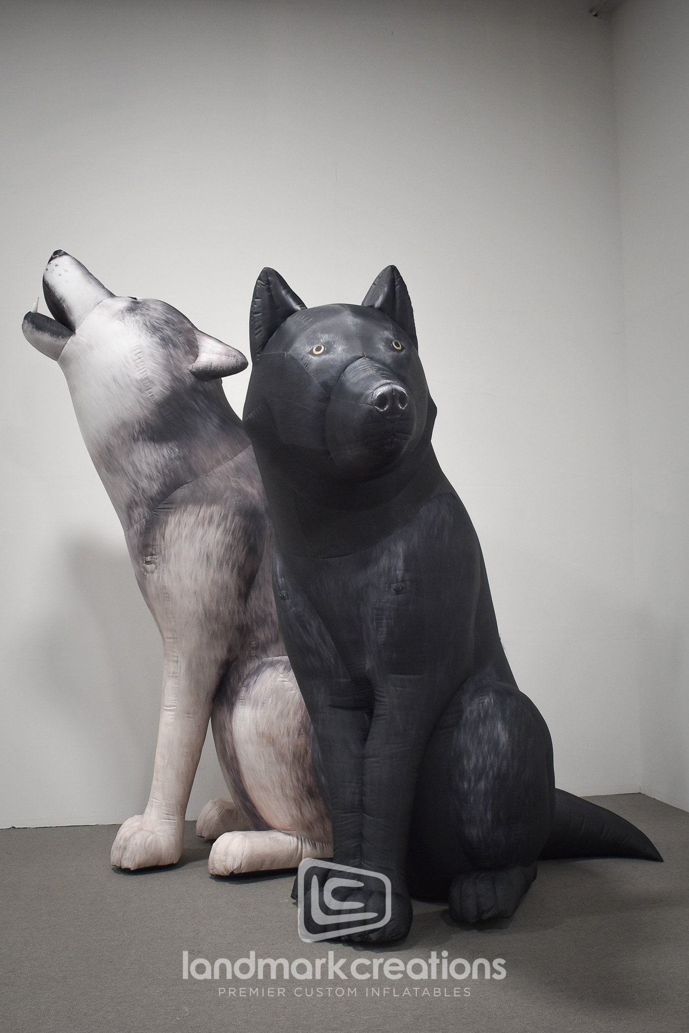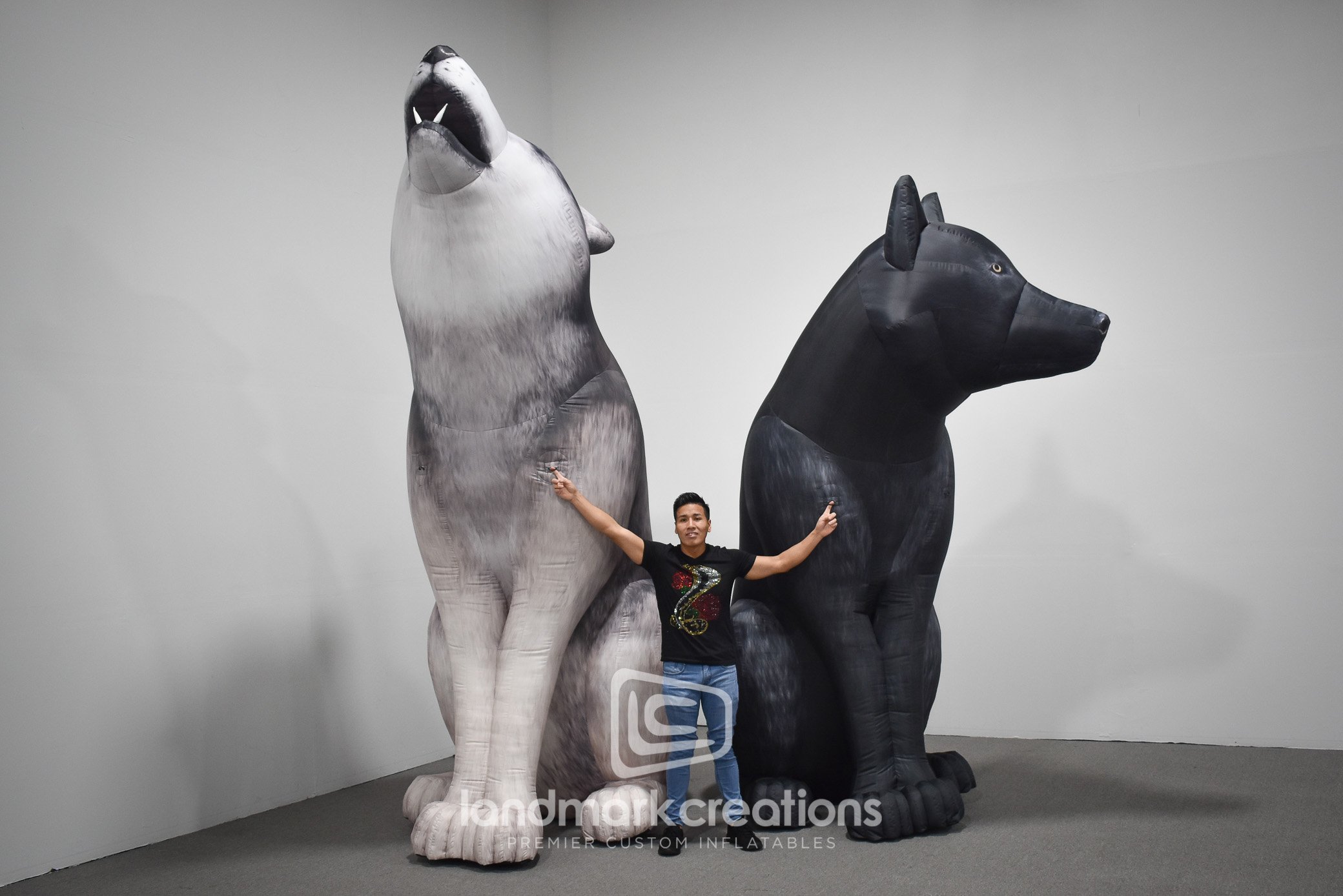 The contrasting light and dark coat colors in this pair of giant inflatable wolf replcas for the Minnesota Zoo created a striking visual in the Minnesota Eco-Region of the "Nature Illuminated" drive-thru exhibit. The exhibit, featuring almost thirty giant displays, was originally created to attract visitors during the pandemic by providing entertainment while educating visitors about endangered species.