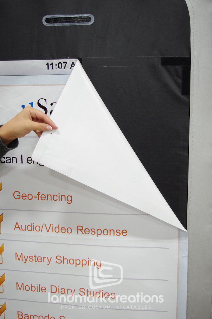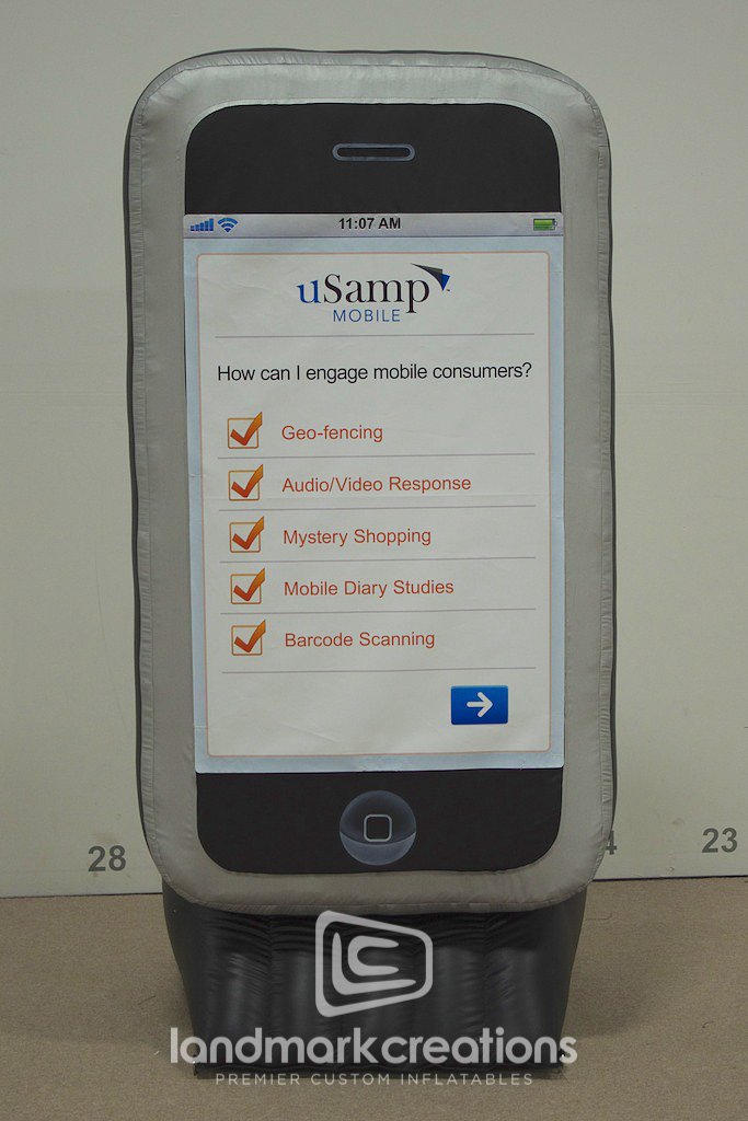 Online market research industry leader, uSamp, uses this inflatable smart phone replica with digital printed message to attract attention at trade shows and meetings.