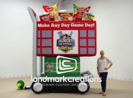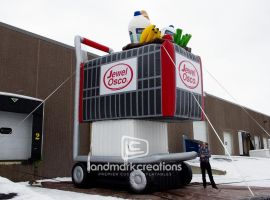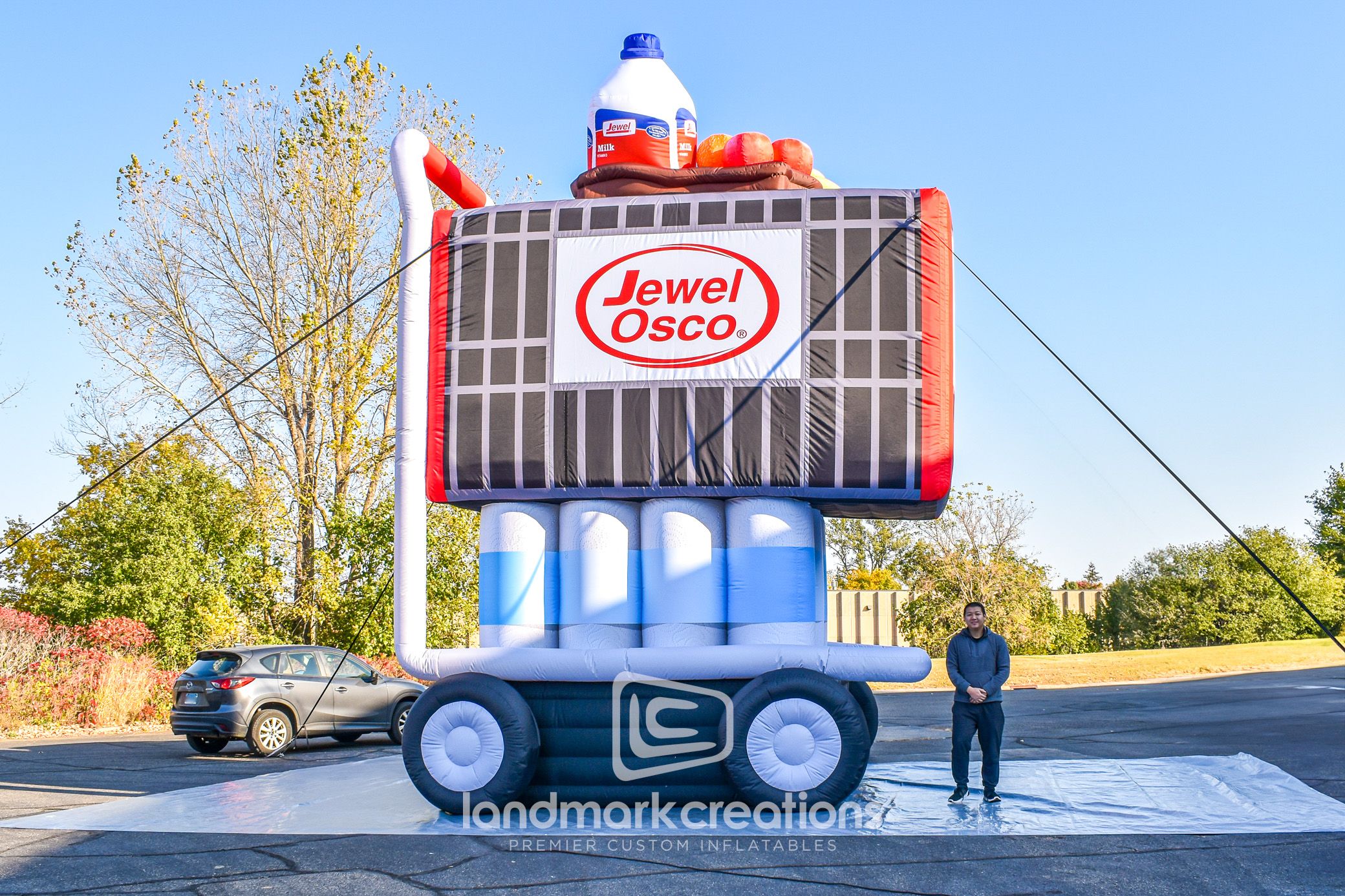Landmark Creations revamped a classic inflatable with updated dimensions and artwork to create a 25-foot-long grocery cart replica for American Drug - Osco Drug. This larger-than-life display features vibrant branding, including a milk jug, apples, oranges, and avocados, tailored for Jewel Osco's retail promotions. Designed for indoor or outdoor use, this custom inflatable draws attention and enhances supermarket marketing campaigns with its eye-catching appeal. Elevate your next retail event with unique and impactful inflatable replicas.