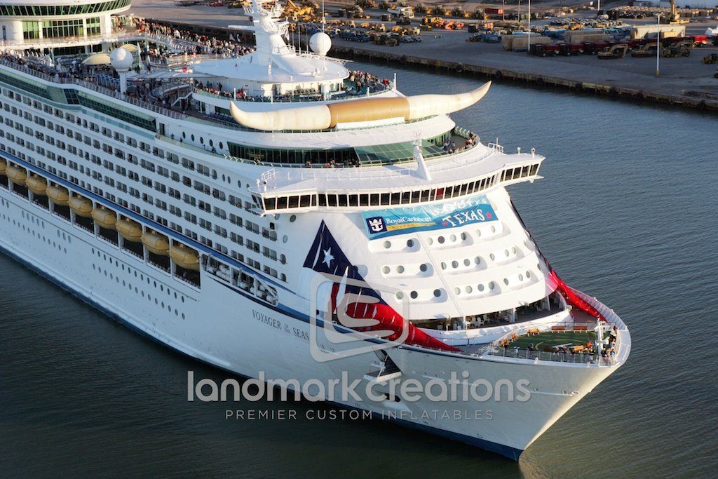 Royal Caribbean Cruise Lines placed these massive, 140-foot inflatable longhorns atop the Voyager ship to announce their luxury cruise ships move to Texas.