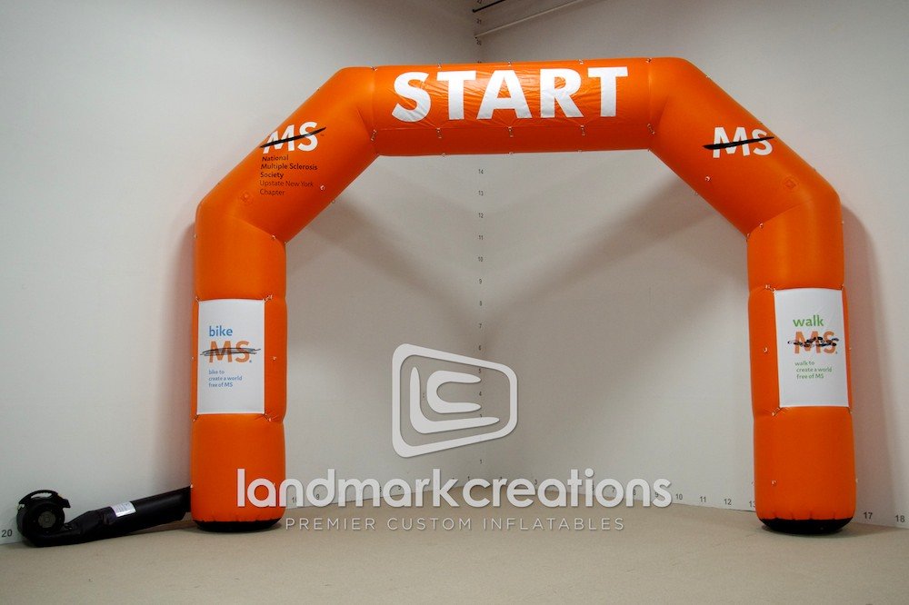 The upstate New York chapter of the Multiple Sclerosis Society boosts local exposure of their events by inflating this bright orange inflatable start / finish line archway.
