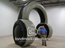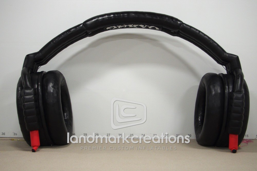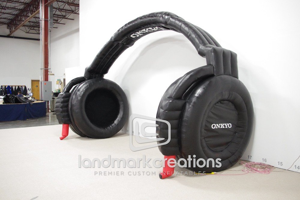 To attract trade show visitors to their booth at the 2013 International Consumer Electronics Show CES in Las Vegas, ONKYO inflates this giant headphone replica. The giant headphones contain functioning speakers in the earpieces to play live music, enticing attendees to the ONKYO booth to learn more about their technology and sound-enhancing products.