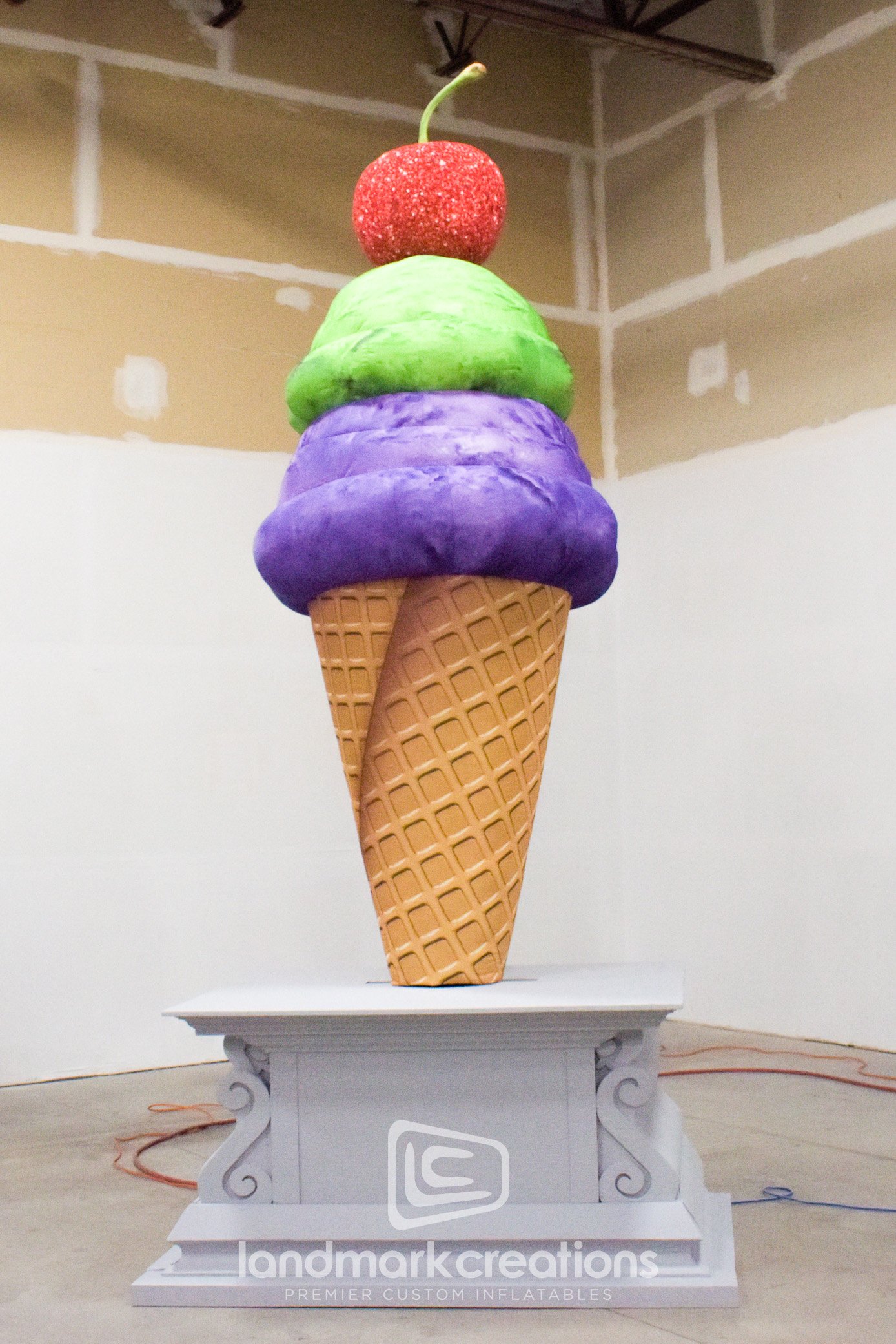 This giant, triple scoop inflatable ice cream cone performs feats of wonder in Cirque du Soleil's live tour of "PAW Patrol". The pedestal of the giant display can be positioned on or off stage using an internal pneumatic lift, the inflatable cone shape tilts, and the giant cherry on top can be remotely detached at will. Landmark Creations offers a wide variety of fabrication options that will allow our inflatable displays to wow audiences with their form and functionality