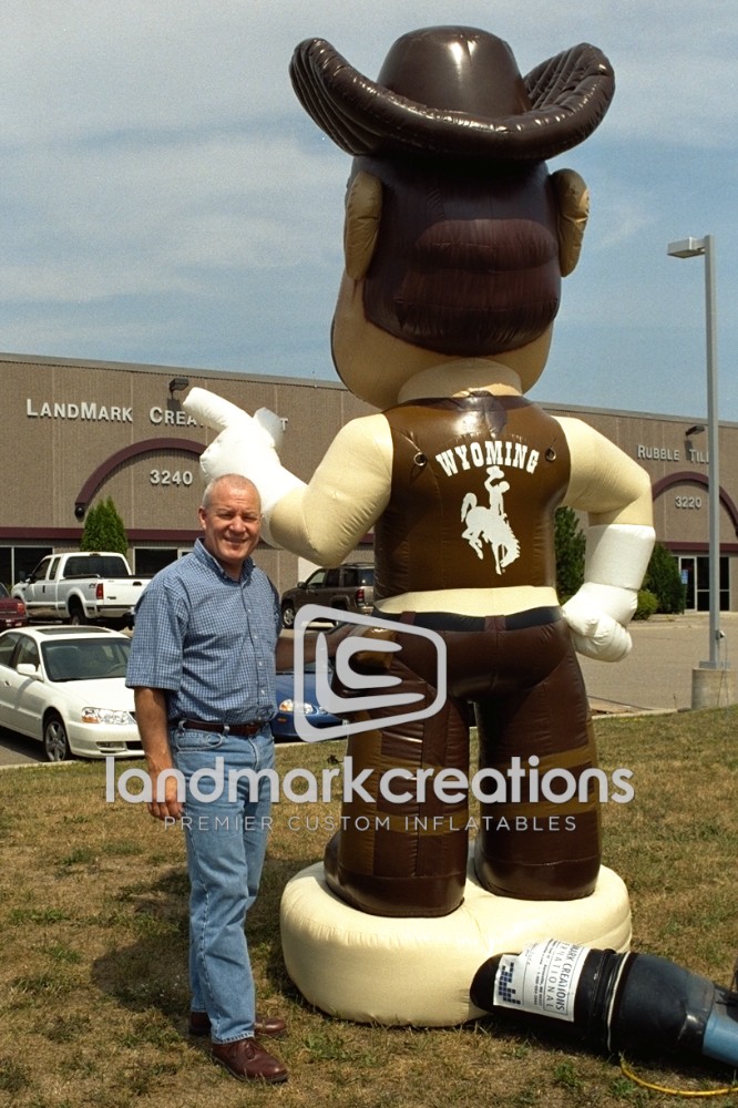 Standing 10 feet tall this inflatable cowboy mascot, Pistol Pete, helps add school spirit and provides a photo opp at campus events surrounding the University of Wyoming.
