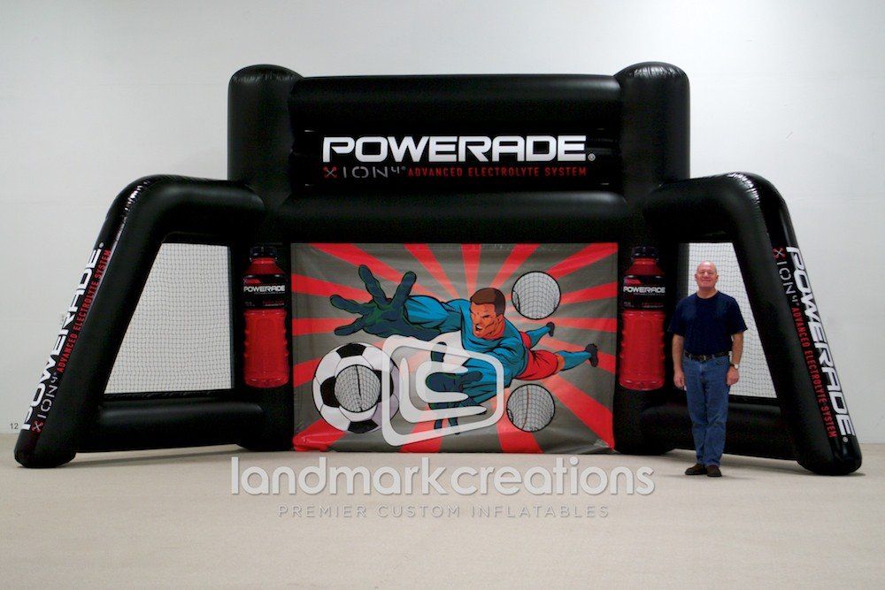 Beverage marketers used this inflatable soccer goal to promote the new drink, POWERADE ION4, at sporting events. Inflatable sports cages are a great addition to marketing campaigns for companies who promote their products to young athletes.