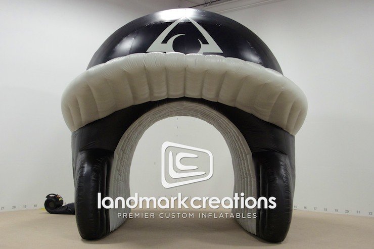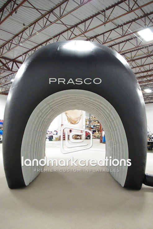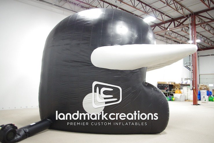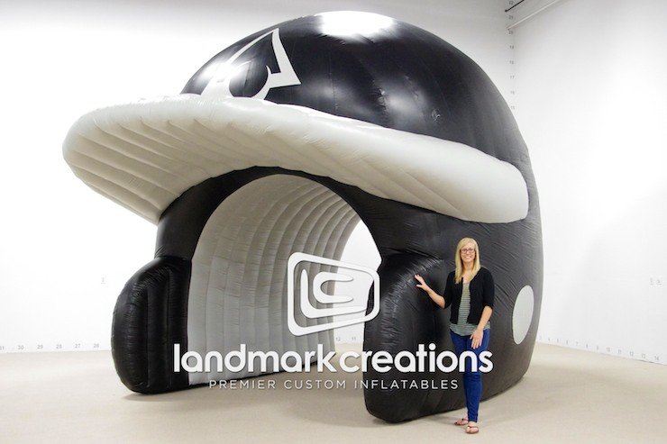 This inflatable baseball helmet tunnel is used at a variety of sporting events by Prasco Laboratories, including the 2013 NCCAA College Baseball World Series at Prasco Park.
