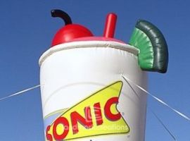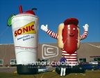SONIC Drive-In restaurant uses this giant inflatable version of their coney dog mascot to greet visitors at grand opening events. Their inflatable coney dog mascot, with friendly smile and striped clothing, also helps promote franchise locations.