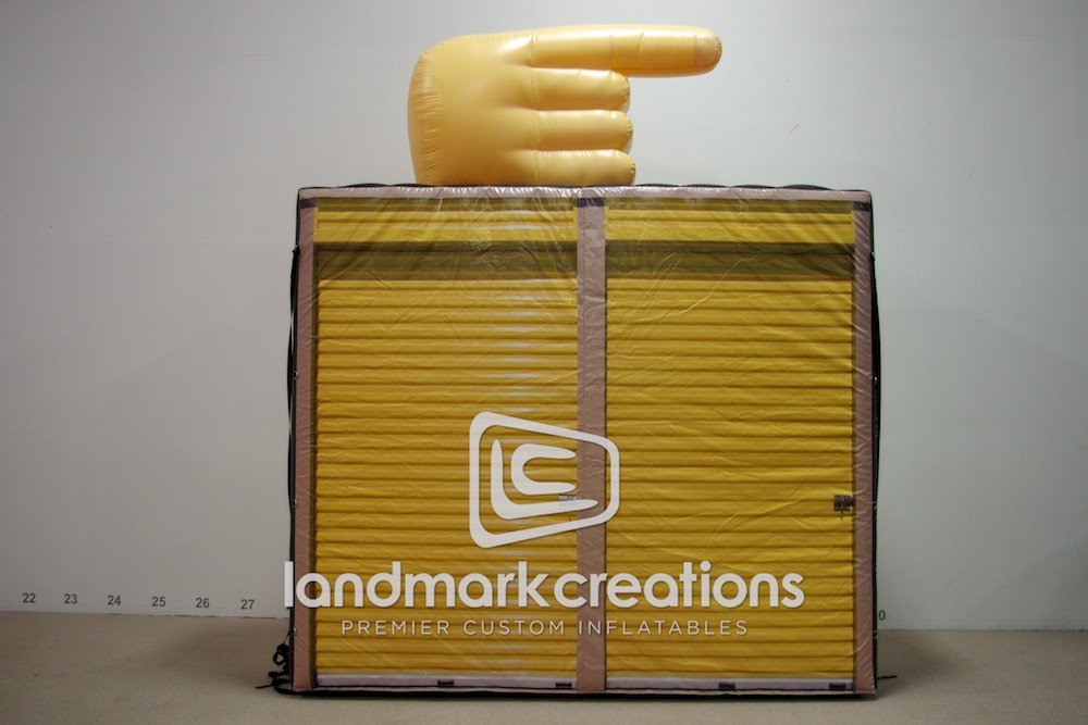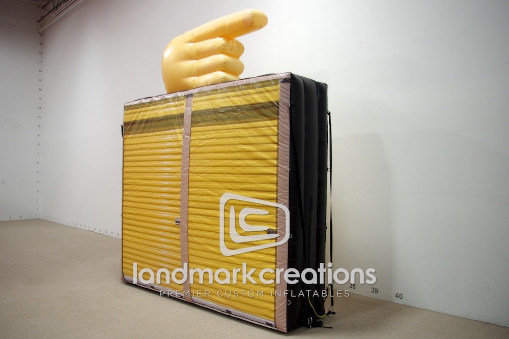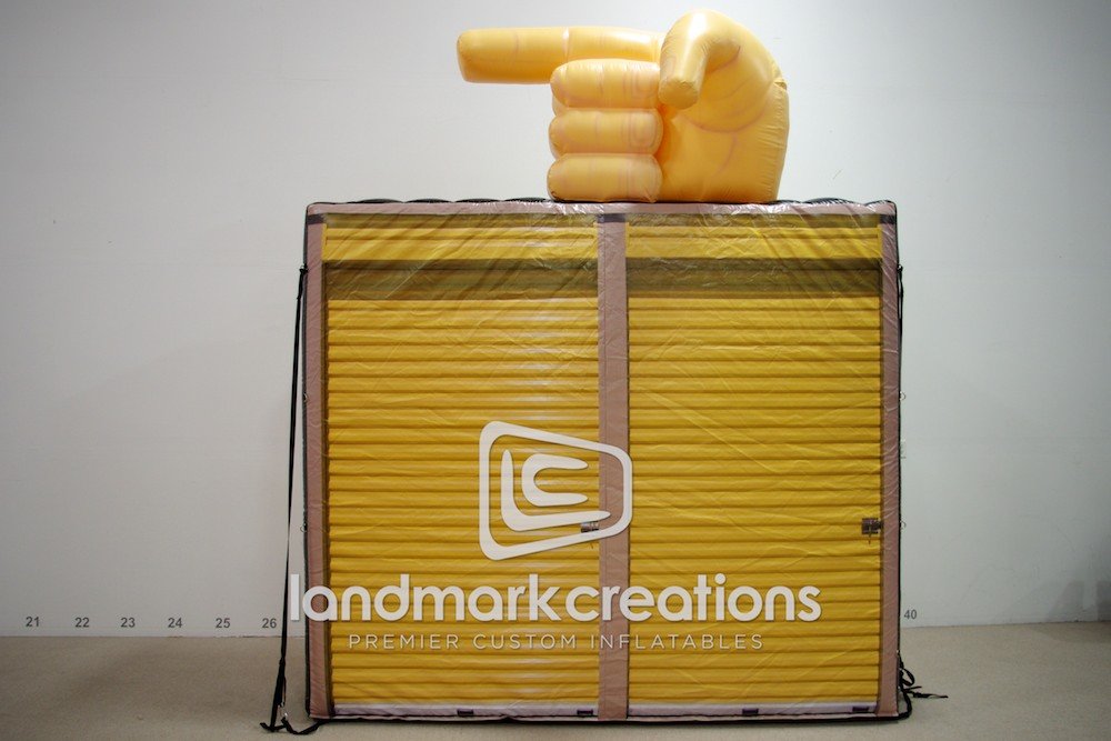 Advertise what your business has to offer with a custom inflatable replica! Storage company GRDM Management draws attention to their storage facilities with an inflatable storage unit replica display. A giant finger sits atop the display to point traffic in the right direction.