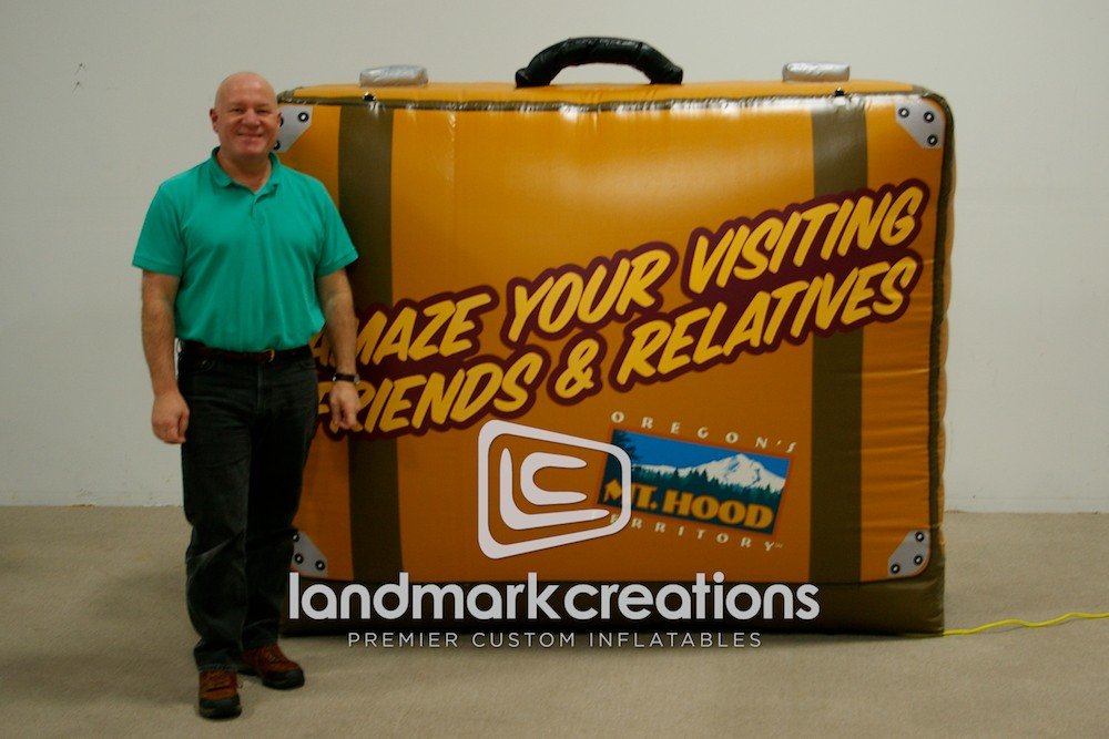 Mount Hood uses their custom inflatable "Got Company Coming?" suitcase display to entice travelers to visit and explore the urban, mountain and valley regions of Oregon.