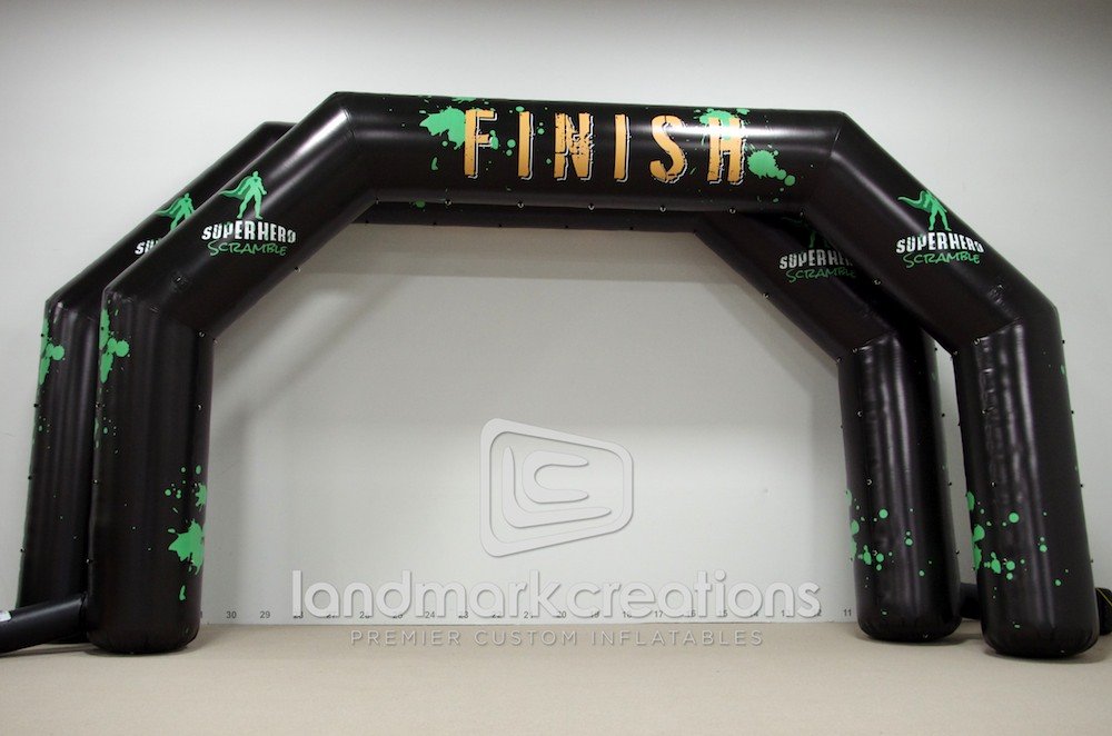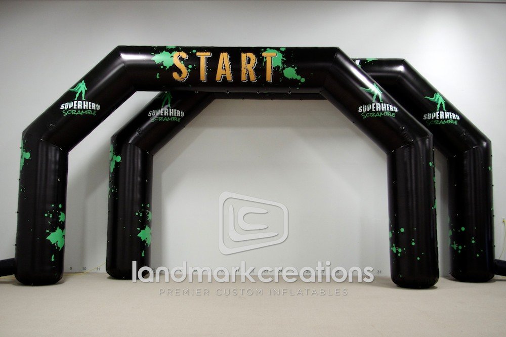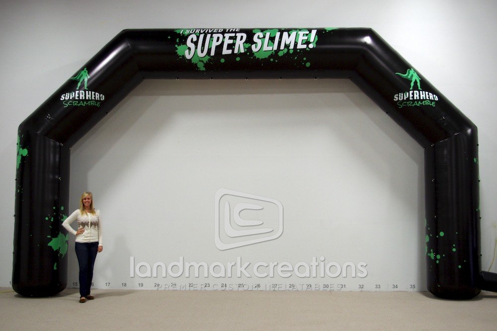 Event planners of SUPERHERO SCRAMBLE, a challenging race course, boost excitement with this custom inflatable ‘Super Slime!’ archway.