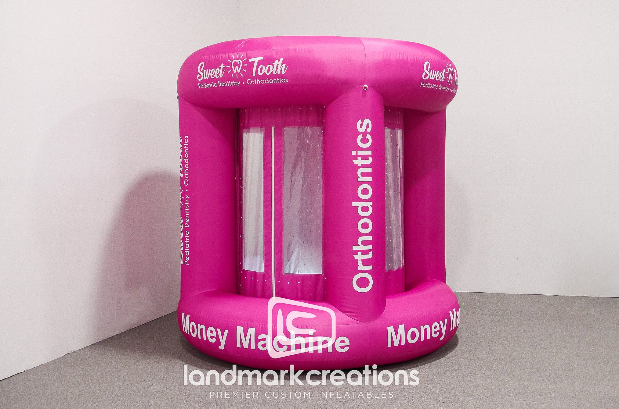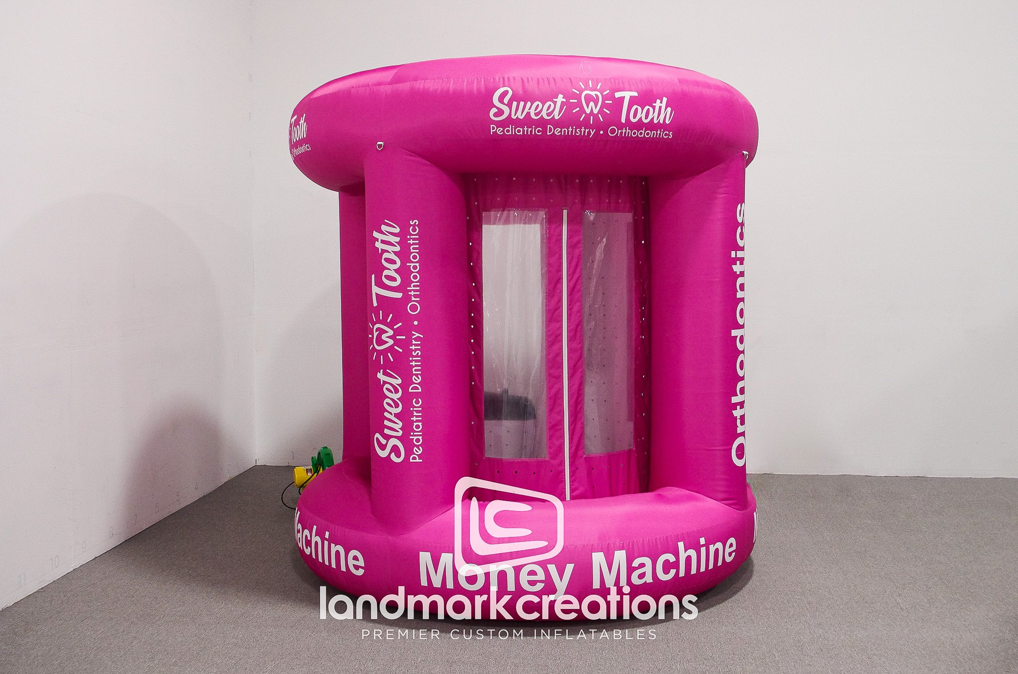 Sweet Tooth Pediatric Dentistry & Orthodonics created a vibrant pink inflatable cash booth to promote their kid-friendly branding at community events. Inflatable cash booths can be used with money or coupons, creating a fun way to interact with crowds while promoting your organization. Because they pack small, they're also easy to transport between events.