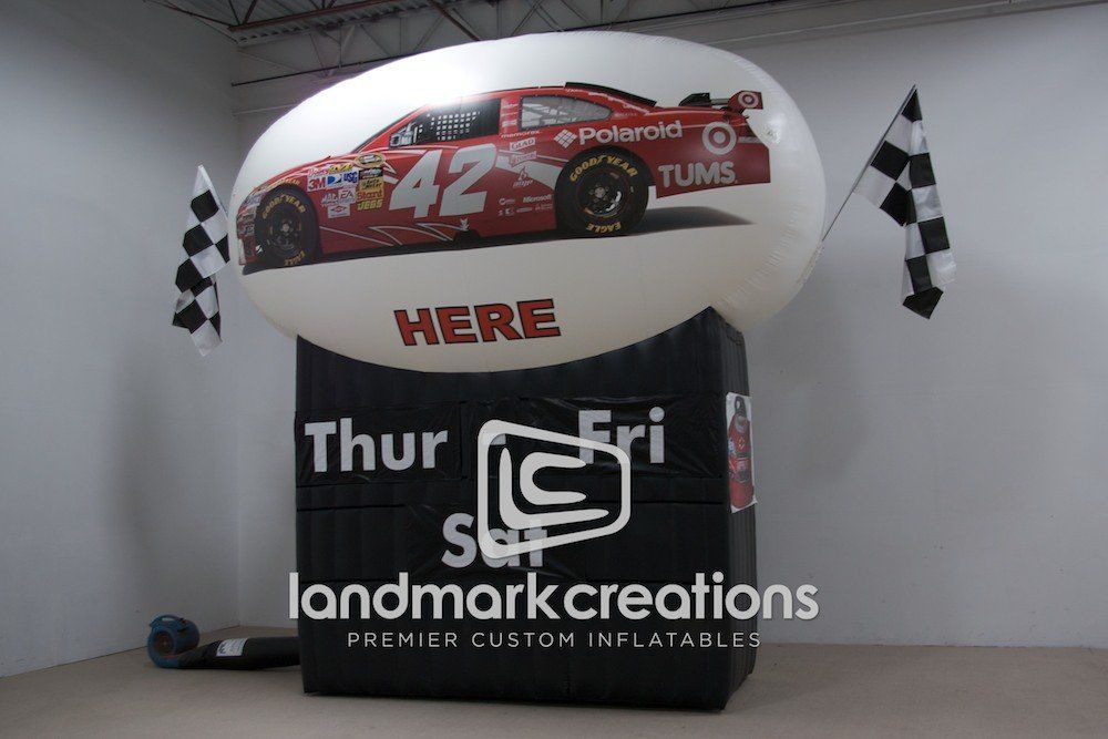 Custom inflatable billboards, like this one for Target Racing, can be designed with space for sponsorship banners. Target Racing displayed sponsors, Polaroid and TUMS, on their inflatable used during outdoor marketing promotions.