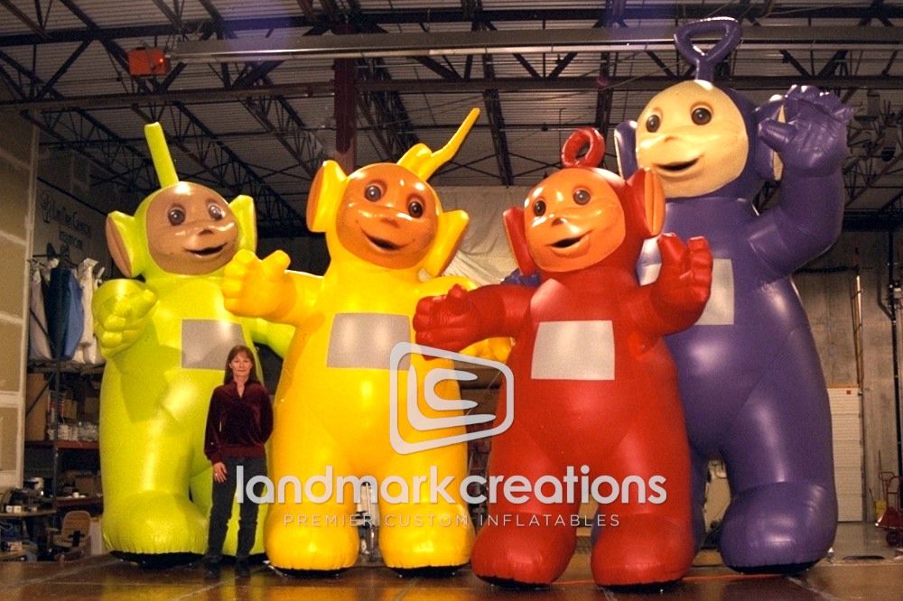 For toy marketers promoting well known characters, giant inflatable replicas like these Teletubbies can be used to get instant recognition at toy fairs and special events.