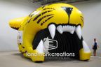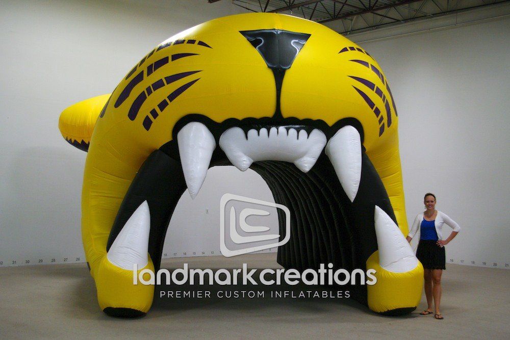 River Parish Tent Rental, a party equipment rental service, leases this inflatable tiger sports tunnel to LSU tailgating fans.