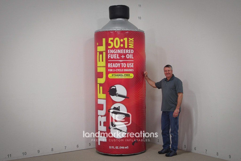 Custom-made inflatables are an easy and effective way to get the word out about your products. Trufuel, maker of special fuels designed for outdoor power equipment, uses their giant inflatable oil can at auto show events throughout the United States.