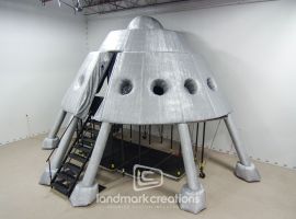 To create an unforgettable atmosphere at the 2025 Bitcoin Conference in Las Vegas, eighteentwentysix partnered with Landmark Creations to design a custom inflatable UFO installation. Suspended above the event’s common area, this 26-foot circular structure was built to surround a central truss housing video panels and high-powered lighting. The UFO’s design carefully accounted for light containment, ensuring optimal visibility for projection without bleed-through. With a mix of spectacle and strategic functionality, the inflatable helped transform the space into a high-tech focal point for attendees and photo ops alike.