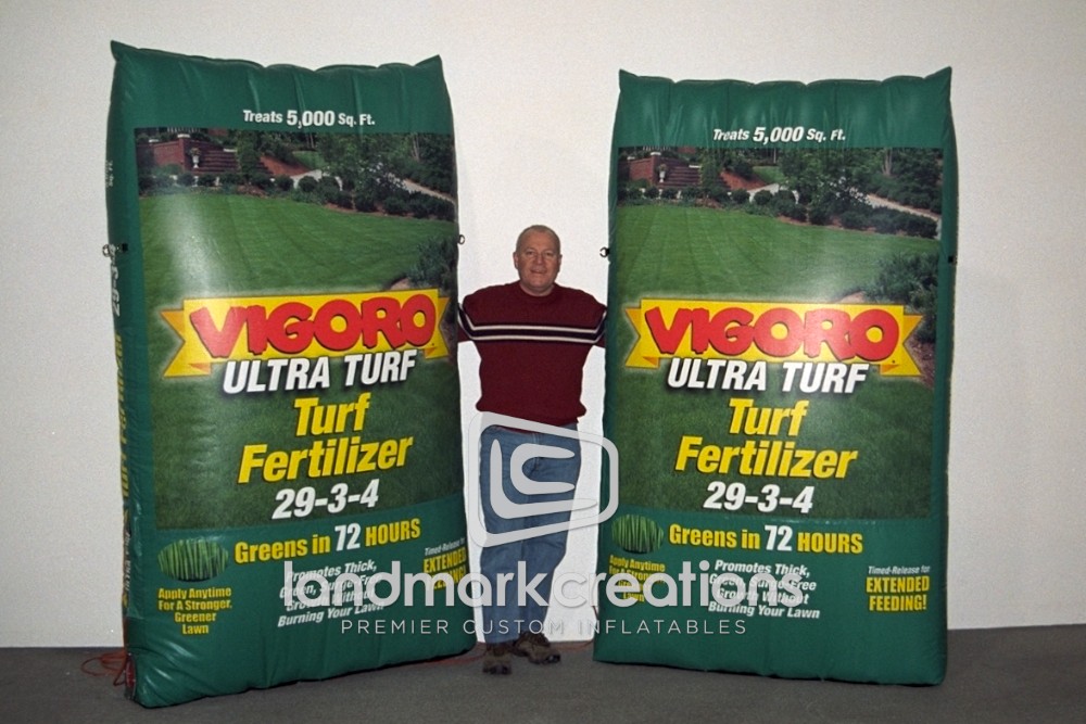 These inflatable product replicas of Vigoro Fertilizer, a Spectrum Brands product, were used to promote the lawn product at NASCAR events including the Busch Series and Nextel Cup Series.