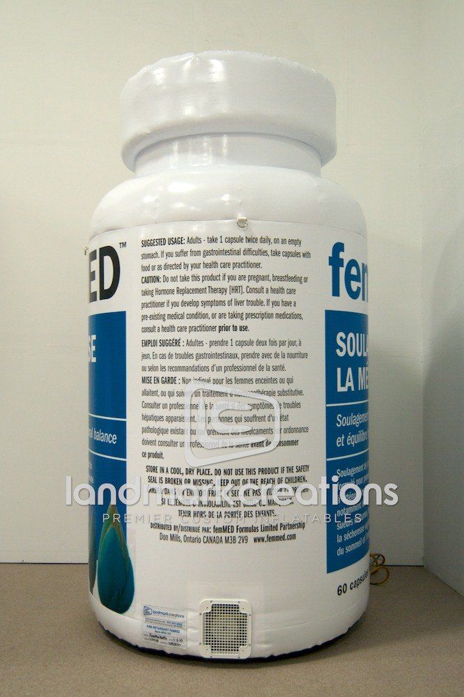 Custom inflatable product replicas are designed to look like their real life counterpart thanks to high-tech printing. femMED promotes their women's health supplements, including quality vitamins, minerals and herbs, by inflating this 7 foot product replica at health expos and trade shows.