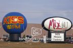 Giant inflatable logo billboards for radio stations KISS 107FM and Mix 94.1 create large visuals and brand recognition at remotes and community events.